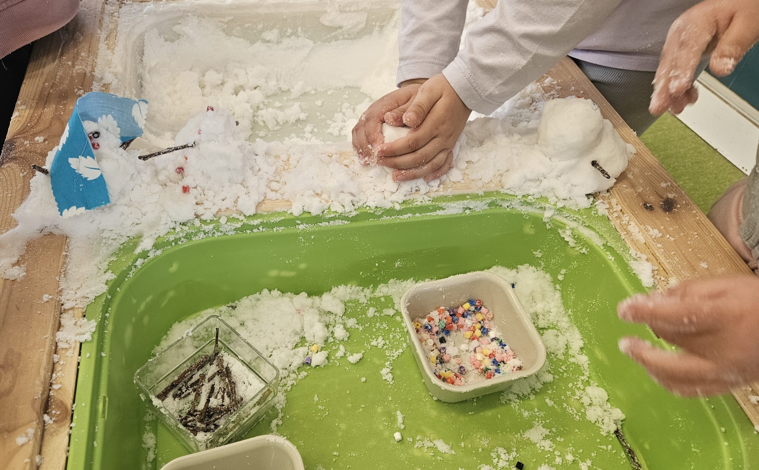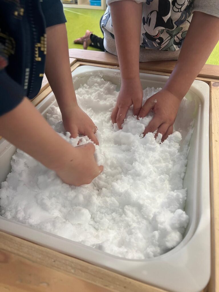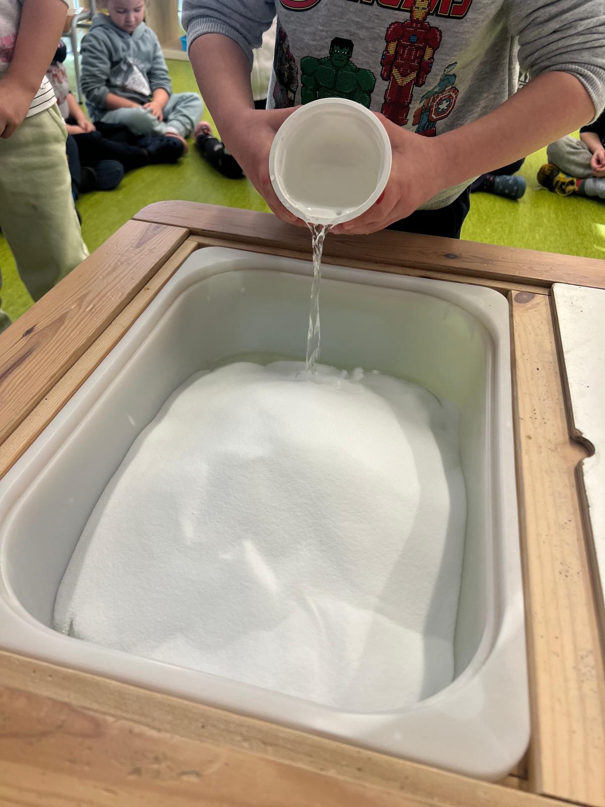 També hem experimentat amb bicarbonat i aigua per fer una neu molt especial! Ens ha encantat tocar-la, modelar-la i observar la seva textura suau i freda. Ha estat una experiència sensorial fascinant.
