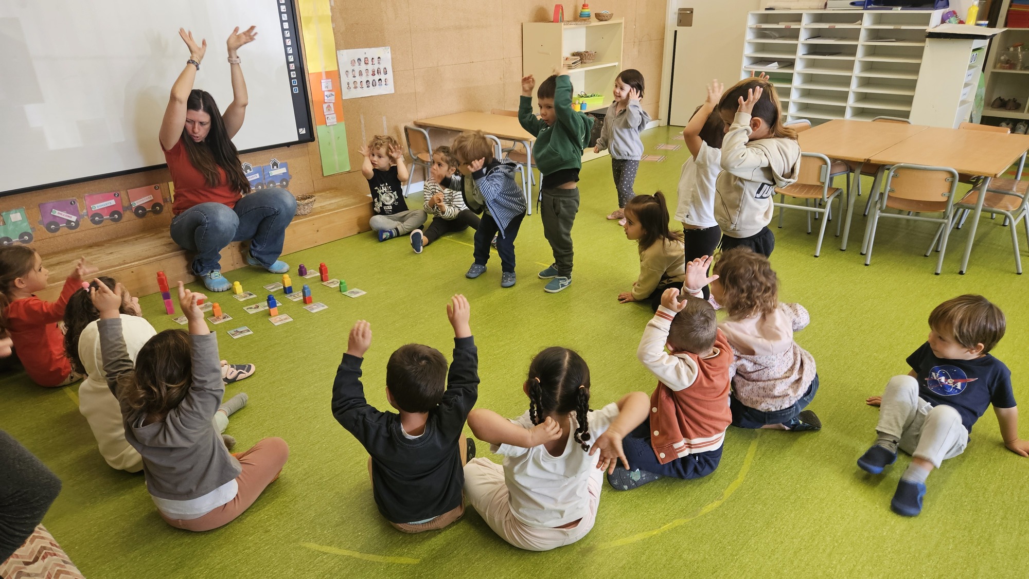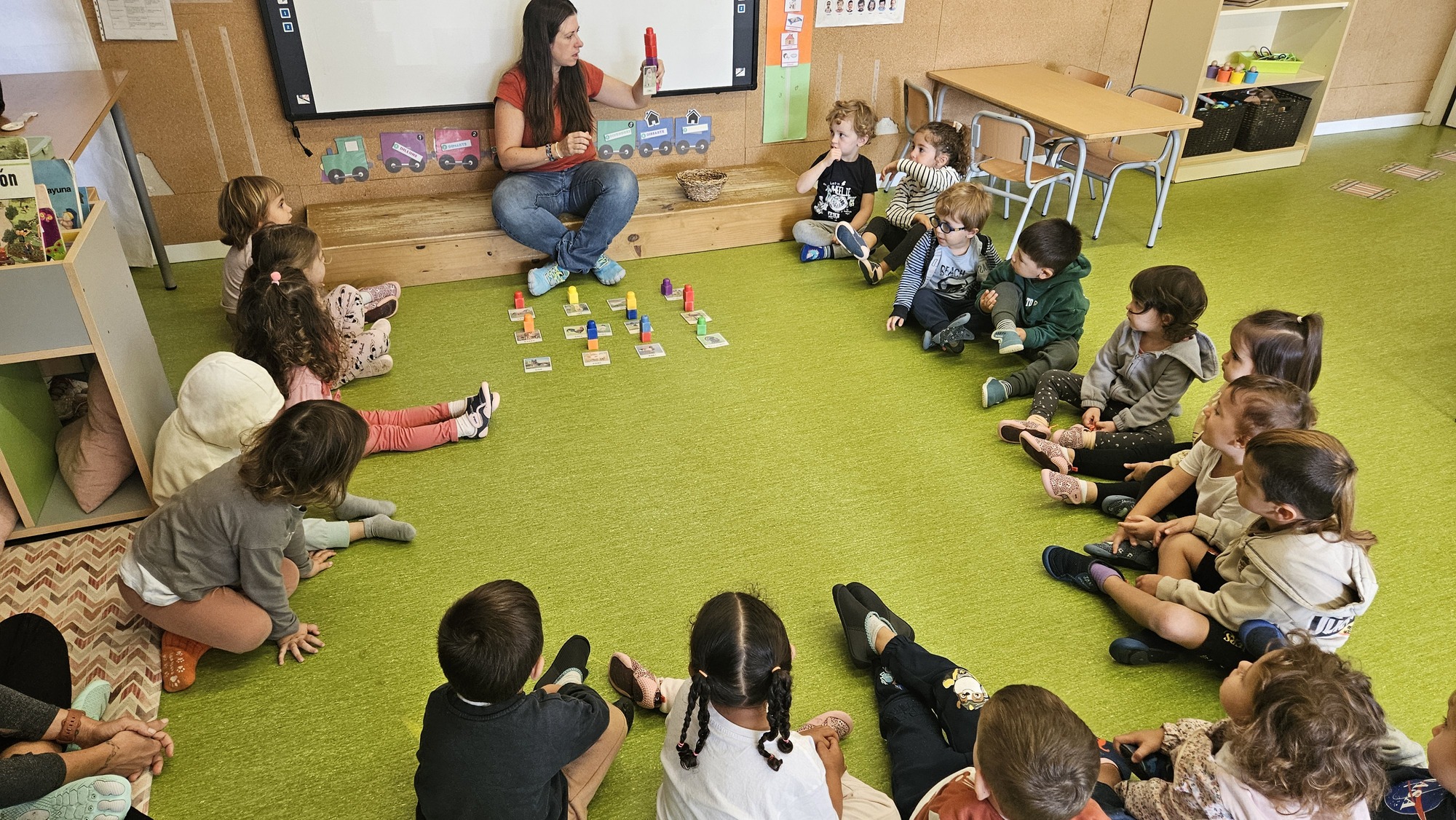 Quan ja en sabíem prou, vam col·locar les imatges de tots els animals al terra i, un per un, cada infant va poder escollir quin volia que fos l’animal que donés nom a la classe. Ho vam fer d’una manera molt divertida: cada vegada que triaven un animal, col·locaven una peça de Lego sobre la seva imatge, i així anàvem construint torres.