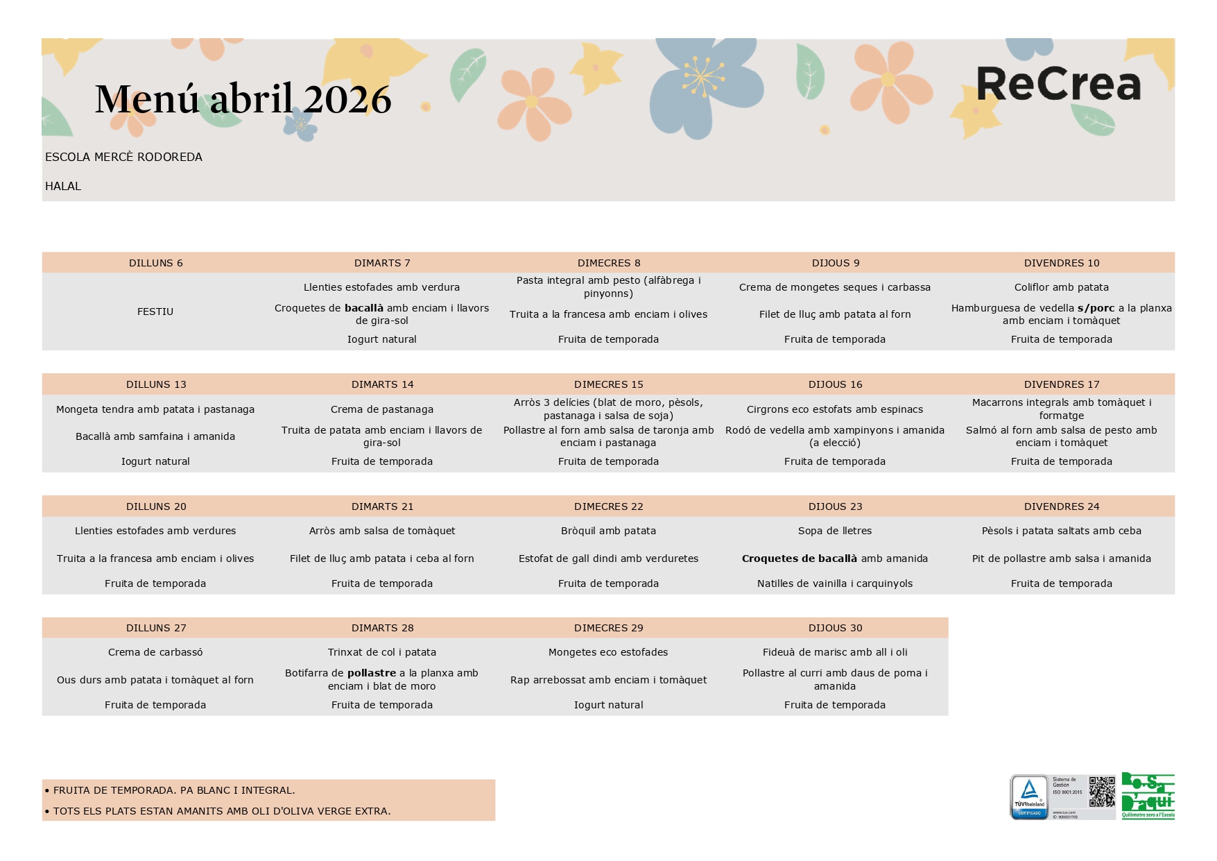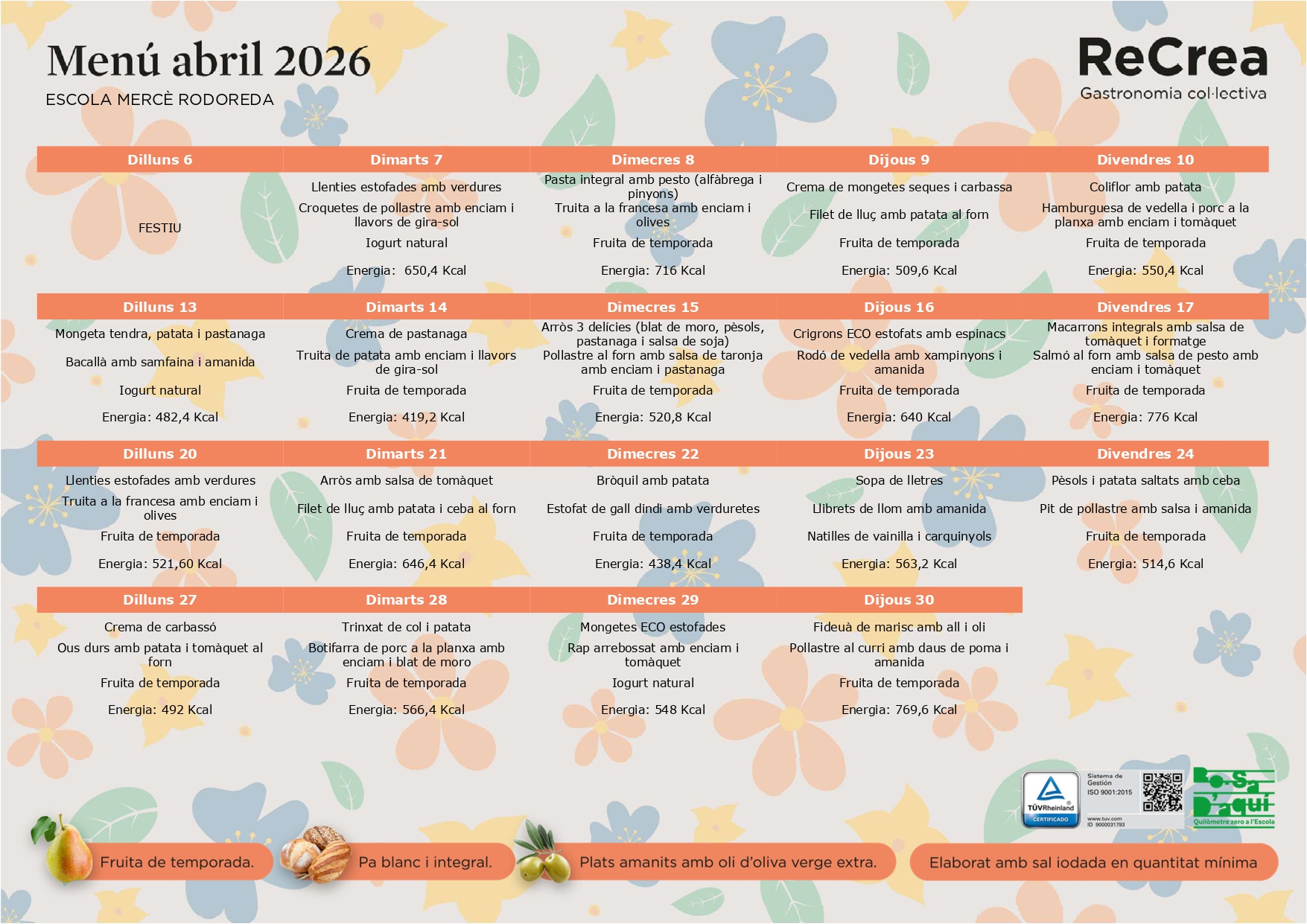 Menús mensuals ***Cuidem el que mengen. Si hi ha al·lèrgies o intoleràncies, preparem un menú adaptat a les necessitats de cada nen o nena.