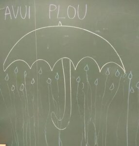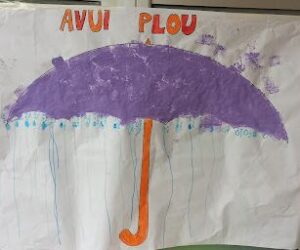 Hem cantat cançons sobre la pluja, he fet el camí de les gotetes a la pissarra, també hem fet el camí de les gotetes al paper d’embalar gran i per acabar hem estampat pintura per acolorir el paraigua.