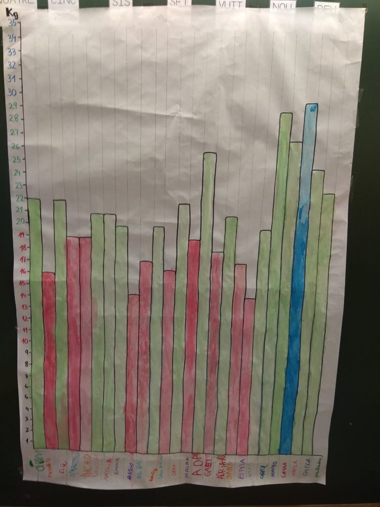 Després de pesar-nos a la bàscula i veure els quilos que pesàvem cadascú. Vam recollir aquestes dades a un gràfic de tota la classe.