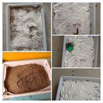 Primer, preparem sorra fina en una safata gran, una capa de farina per sobre i uns “meteorits”.