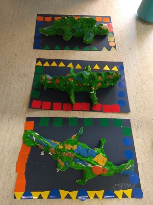 Aquest trimestre a plàstica continuem aprenent amb l’artista Antoni Gaudí. Hem descobert que també va fer un jardí “El Park Güell”, on hi ha una font amb una sargantana o drac d’aigua. Ens ha agradat tant que hem decidit fer la nostra pròpia versió de la sargantana. El cos l’hem fet amb fang i el trencadís amb ous pintats.