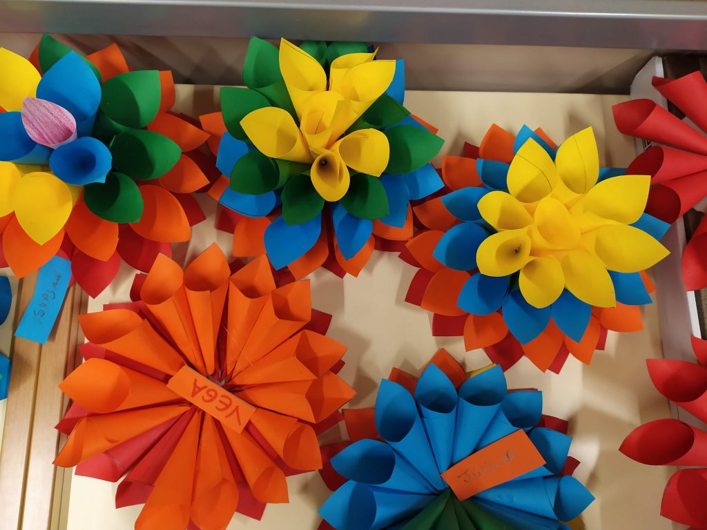 A partir d’una expressió escrita de castellà, les i els alumnes de 6è hem fet flors de paper decoratives.