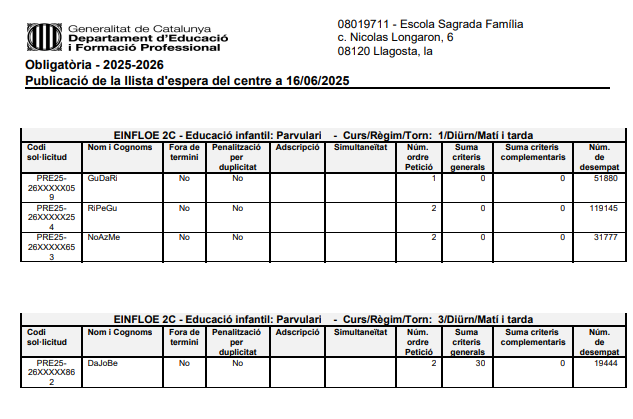 El període de matriculació amb cita serà els dies 25 i 26 de juny. Les famílies assignades us heu de posar en contacte amb l’escola per demanar cita prèvia per entrega de documentació i entrevista.