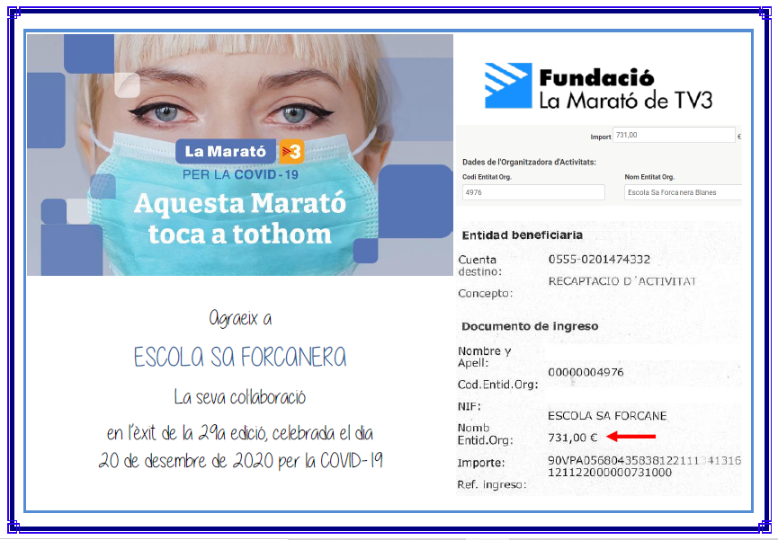 Un any més, l’escola Sa Forcanera ha aportat el seu granet de sorra a la 29a edició de La Marató de TV3 dedicada a la Covid-19 amb l’objectiu de fer una recerca per a la investigació i així trobar tractaments per curar-la.