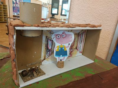 El porquet gran va fer una casa gran de maons, amb xemeneia i tot! Per cert, els maons els hem fet NOSALTRES A LA CLASSE!!