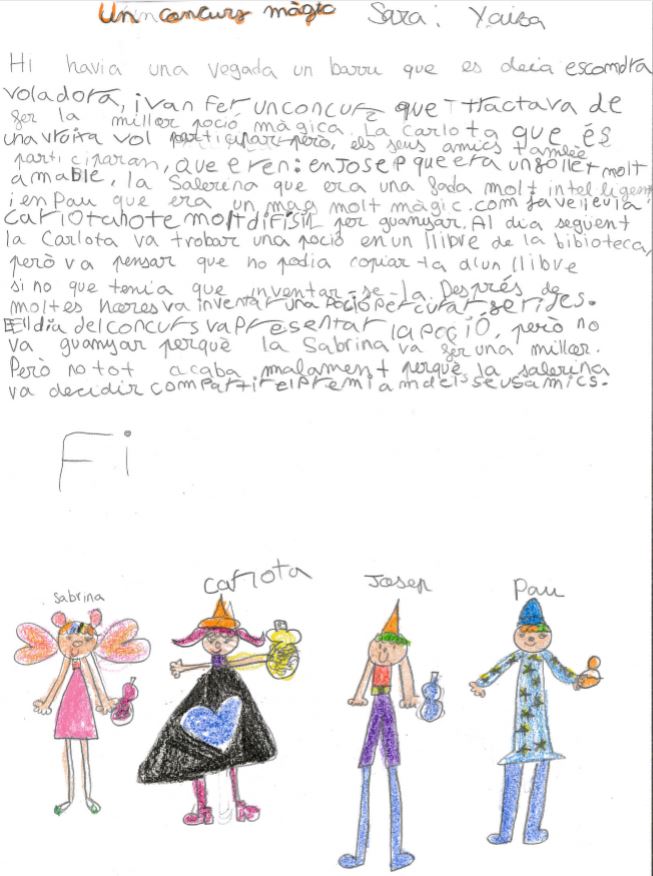 Aquesta vegada l’apadrinament lector ha estat diferent. Enlloc de llegir i parlar d’un conte, els nens i nenes de 6è havien preparat una primer idea per escriure un conte i, junt amb els nens i nenes de 6è el van acabar de pensar, redactar i fer un dibuix! Ha estat una molt bona experiència perquè tots junts han pogut aprendre molt!