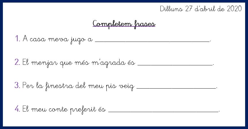 1. EN UN FULL POSAREM EL NOM I LA DATA I A SOTA HAUREM DE COMPLETAR LES FRASES QUE US POSO. COPIEU LA PRIMERA PART IGUAL I US INVENTEU EL FINAL DE LA FRASE.
