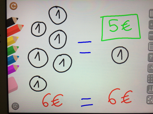 Per exemple: si jo tinc 6 monedes d’1€ ho puc reduir dibuixant un bitllet de 5€ i una moneda d’1€ i continua sent la mateixa quantitat.