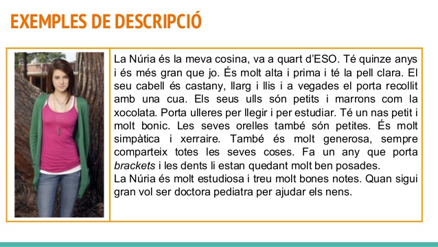 Si feu una mica de memòria a l’escola ja havíem descrit a una company o companya de la classe. Recordeu seguir l’ordre que trobareu a l’explicació del tema d’avui, i també utilitzar els adjectius que ens ajudaran a dir com és l’aspecte físic d’algú i com és el seu caràcter. La descripció la podeu fer a la llibreta de tasques. També podeu fer un dibuix de la persona que descriviu.