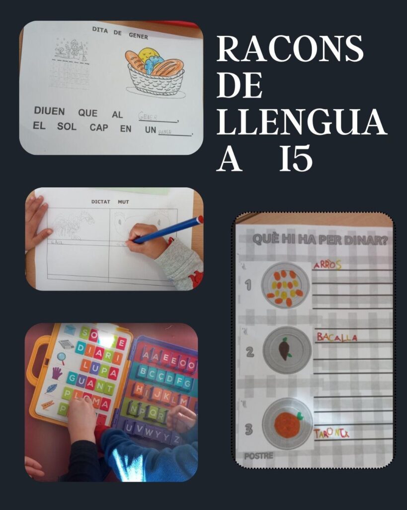 A Infantil 5 anys treballem la consciència fonològica i la lectoescriptura en racons de llengua. Ho fem amb activitats lúdiques i adaptades al ritme de cada infant.