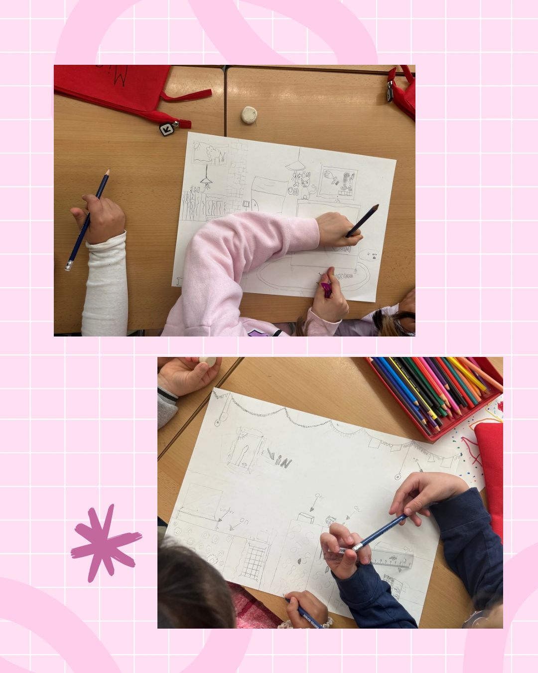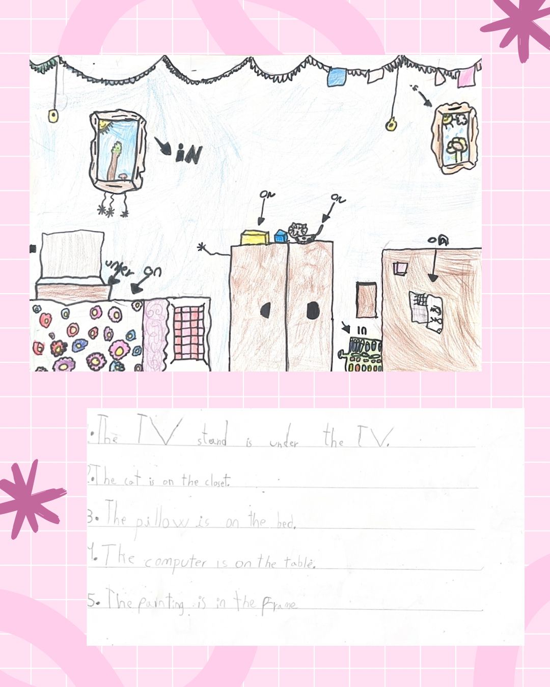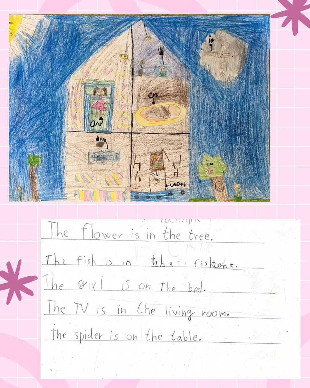 Han dibuixat habitacions i paisatges preciosos i hi han escrit frases per descriure on són els objectes 🐱🪑📚.