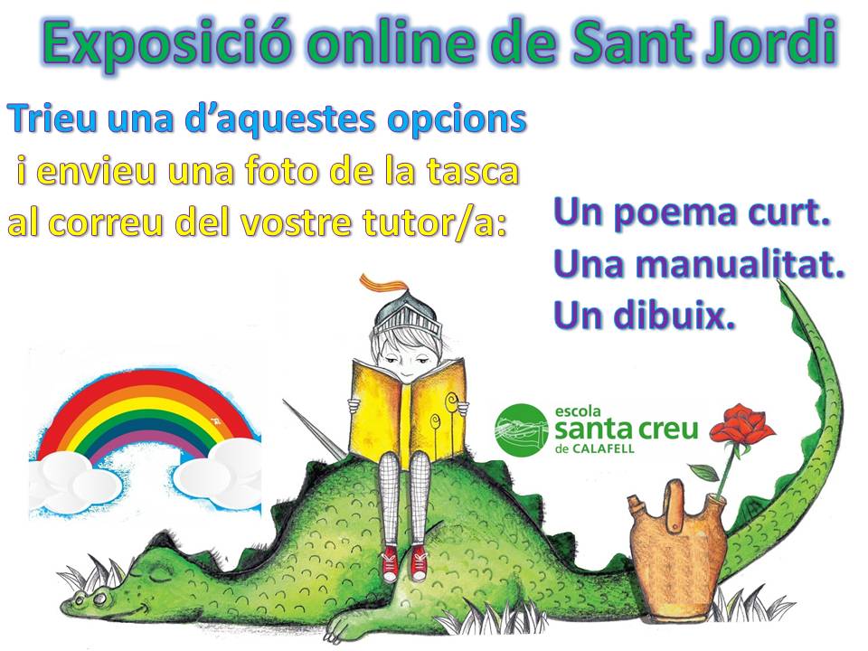 tot l’equip de mestres us proposem una activitat que de segur serà molt atractiva per aquest Sant Jordi tan especial. Els vostres fills i filles han de triar una opció: un poema curt, una manualitat o fer un dibuix. La temàtica com no, ha de ser sobre Sant Jordi. Aquesta activitat és completament voluntària però us animem a participar!