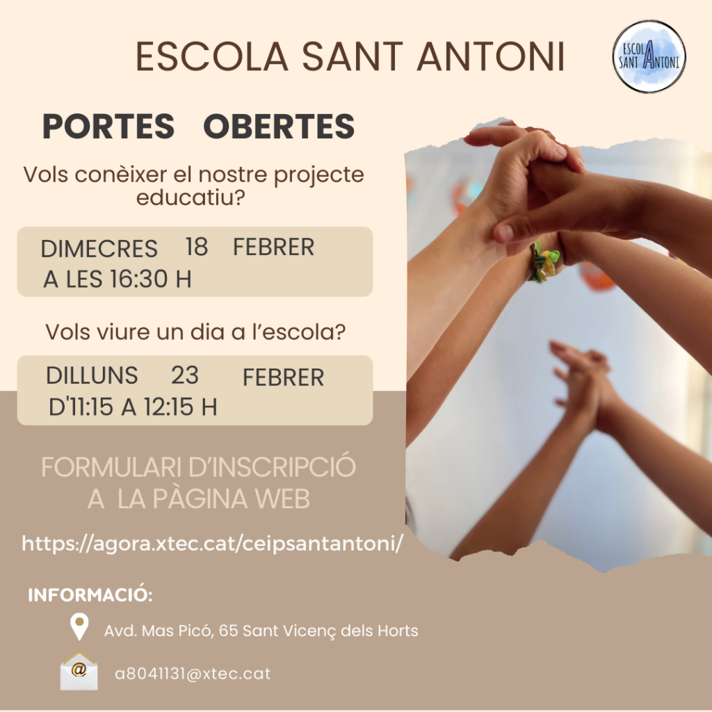 El dimecres 18 de febrer a les 16:30h començarem fent una visita per diferents espais, on podreu parlar amb les mestres, fer preguntes, resoldre dubtes … Tot seguit, farem una explicació del projecte educatiu de l’escola.