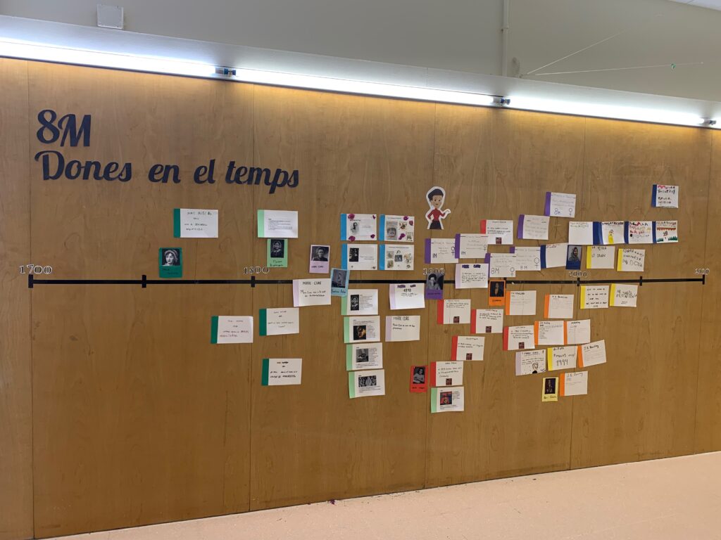 L’escola ha volgut doncs celebrar aquest dia realitzant una línia del temps amb dones importants de la història. Cada grup ha treballat una dona, i ha posat a la línia esdeveniments importants de la seva biografia. A més, la Comunitat de petits també ha fet un mural on ha plasmat les mans en el cabell d’una dona.