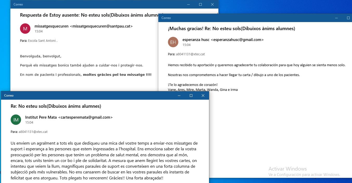 Us fem arribar les respostes dels Hospitals a qui varem adreçar els vostres dibuixos d’ànims, per a tots els malalts, que ho estan passant malament, i per el personal sanitari que amb el seu esforç estan fent que aviat puguem tornar a la normalitat