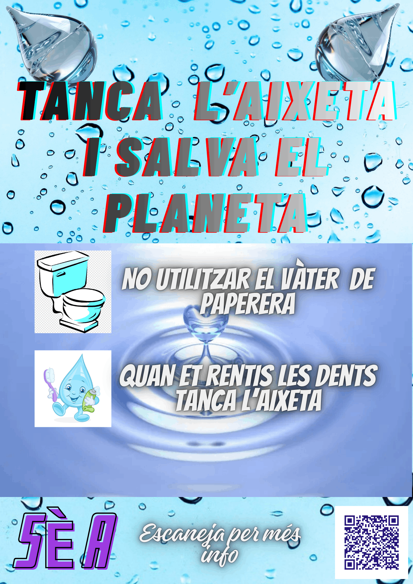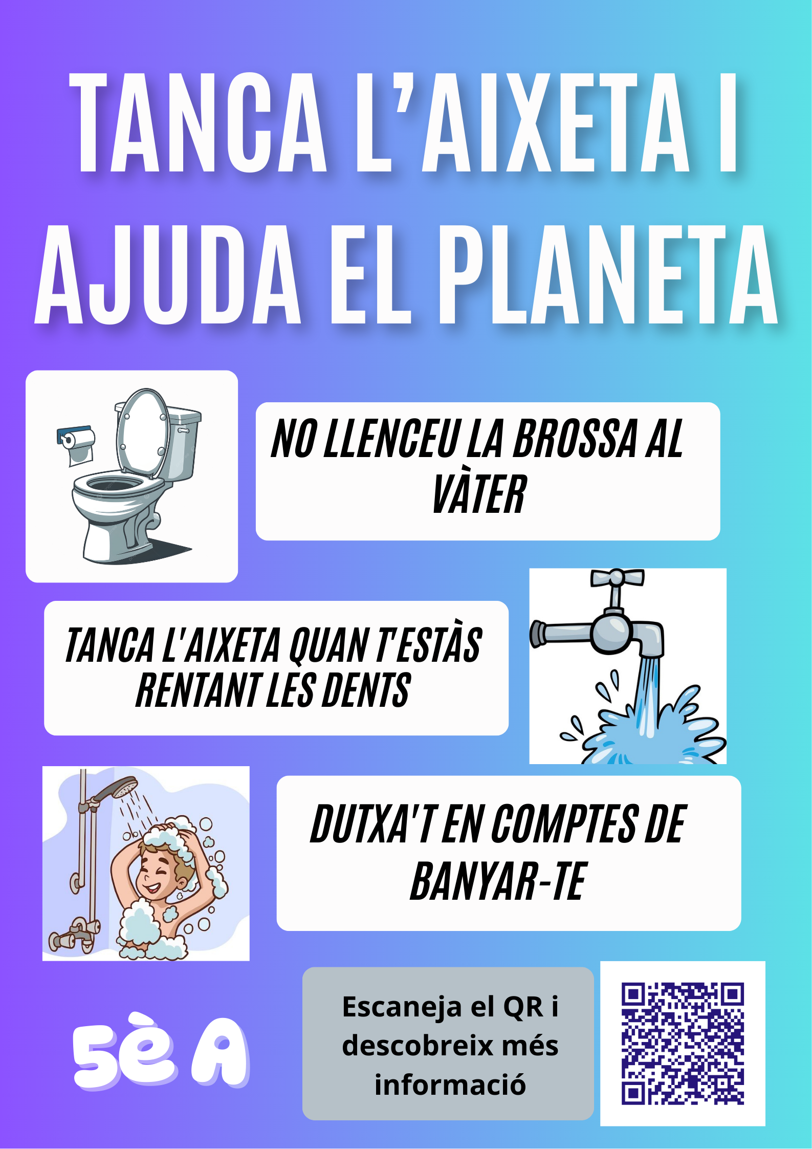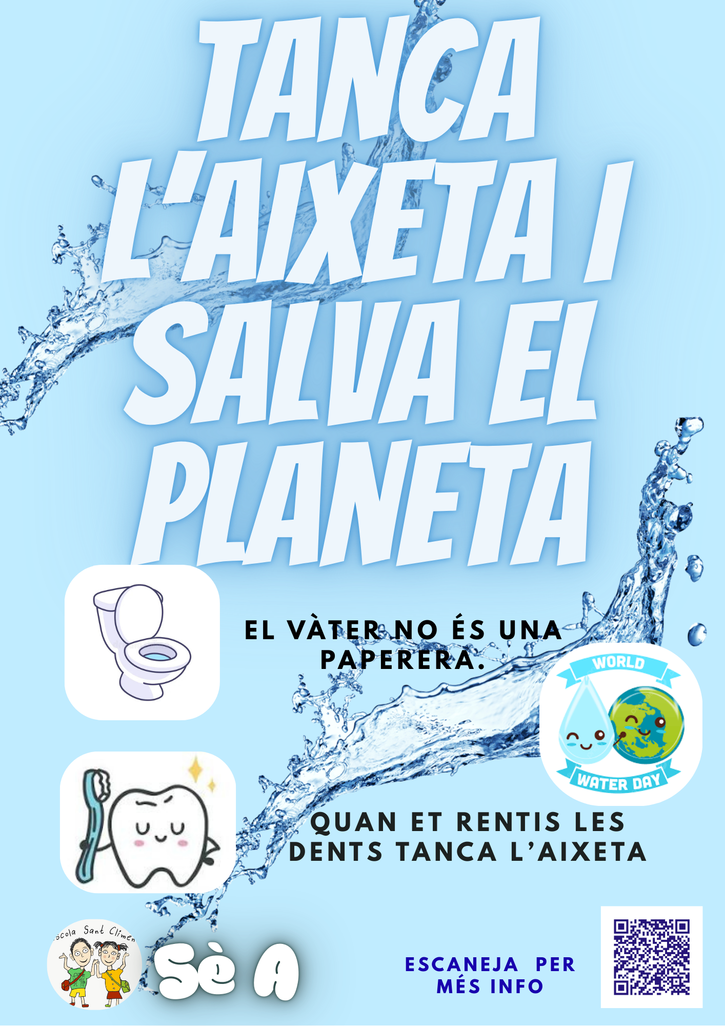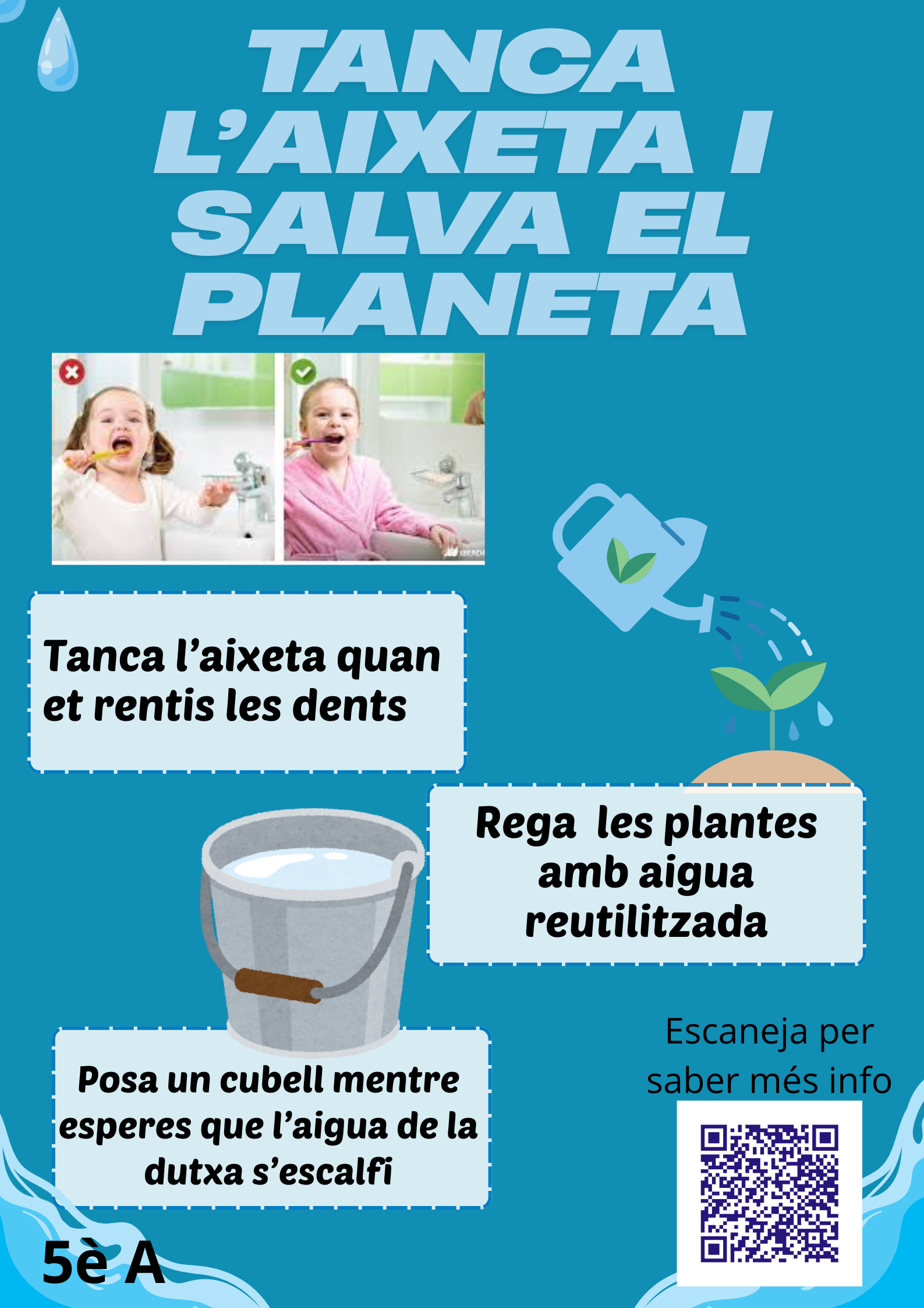 Els infants de 5è A han fet un projecte sobre l’aigua amb el propòsit de conscienciar a la població de Sant Climent a favor de l’estalvi i la reutilització de l’aigua. Van iniciar aquest projecte al primer trimestre, amb la col·laboració d’una experta de l’AMB (Àrea Metropolitana de Barcelona) i l’han finalitzat al mes de febrer.