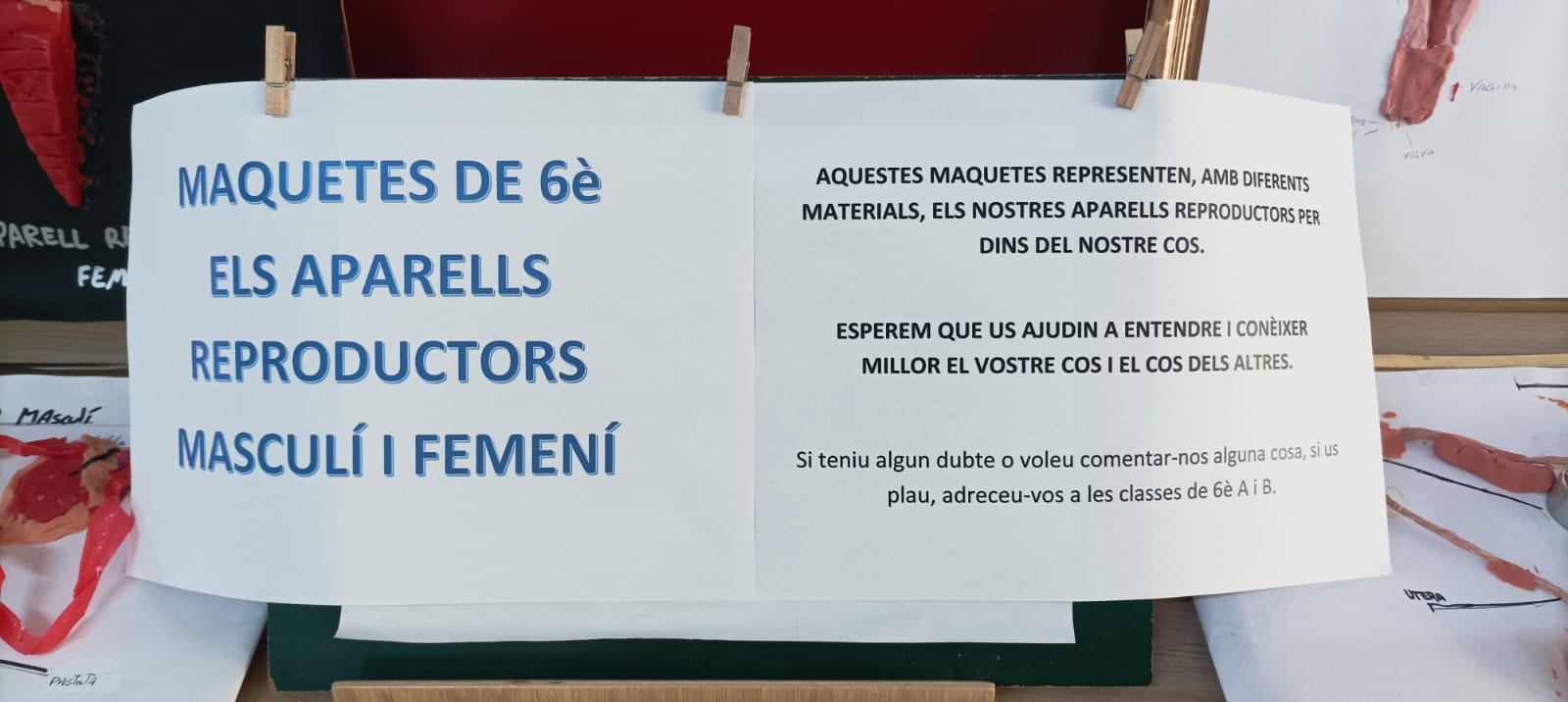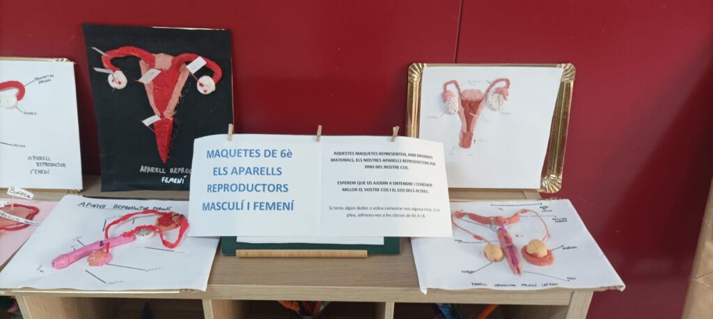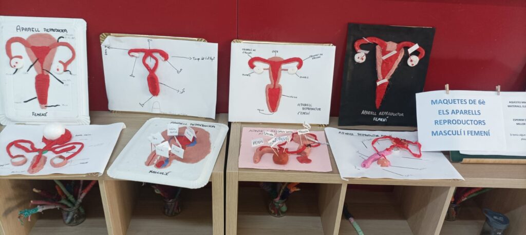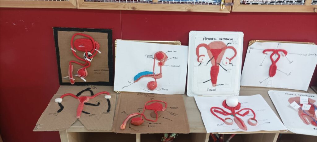 Arrel de tot aquest treball els infants han realitzat maquetes amb diferents materials que representen els aparells reproductors femení i masculí que finalment hem exposat a l’entrada de l’escola, per tal que la resta de la comunitat educativa pugui aprendre i generar converses el més normalitzades possibles a les seves aules i a casa.