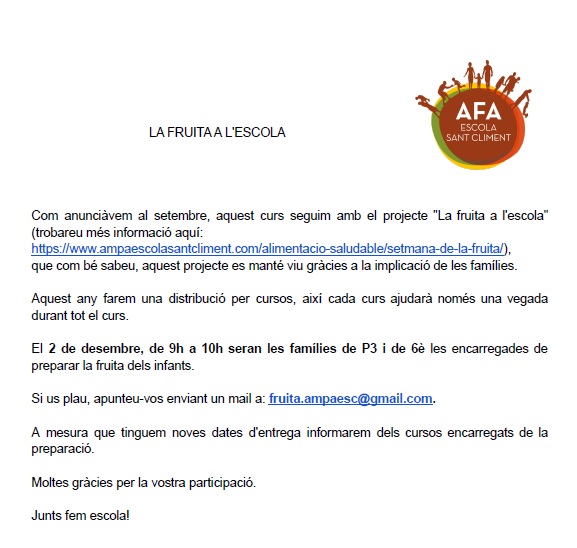 El proper mes de desembre iniciem el repartiment d’aquest curs i, per aquest motiu, us compartim un escrit de l’AFA i us animem a participar-hi activament.