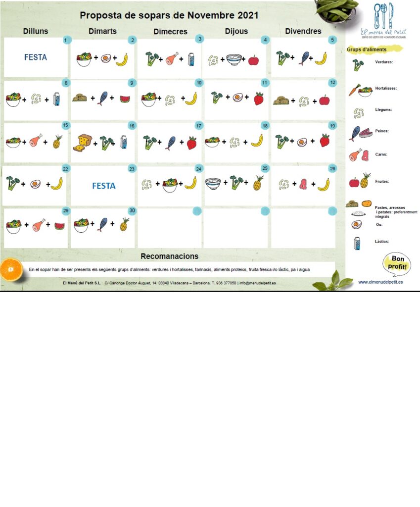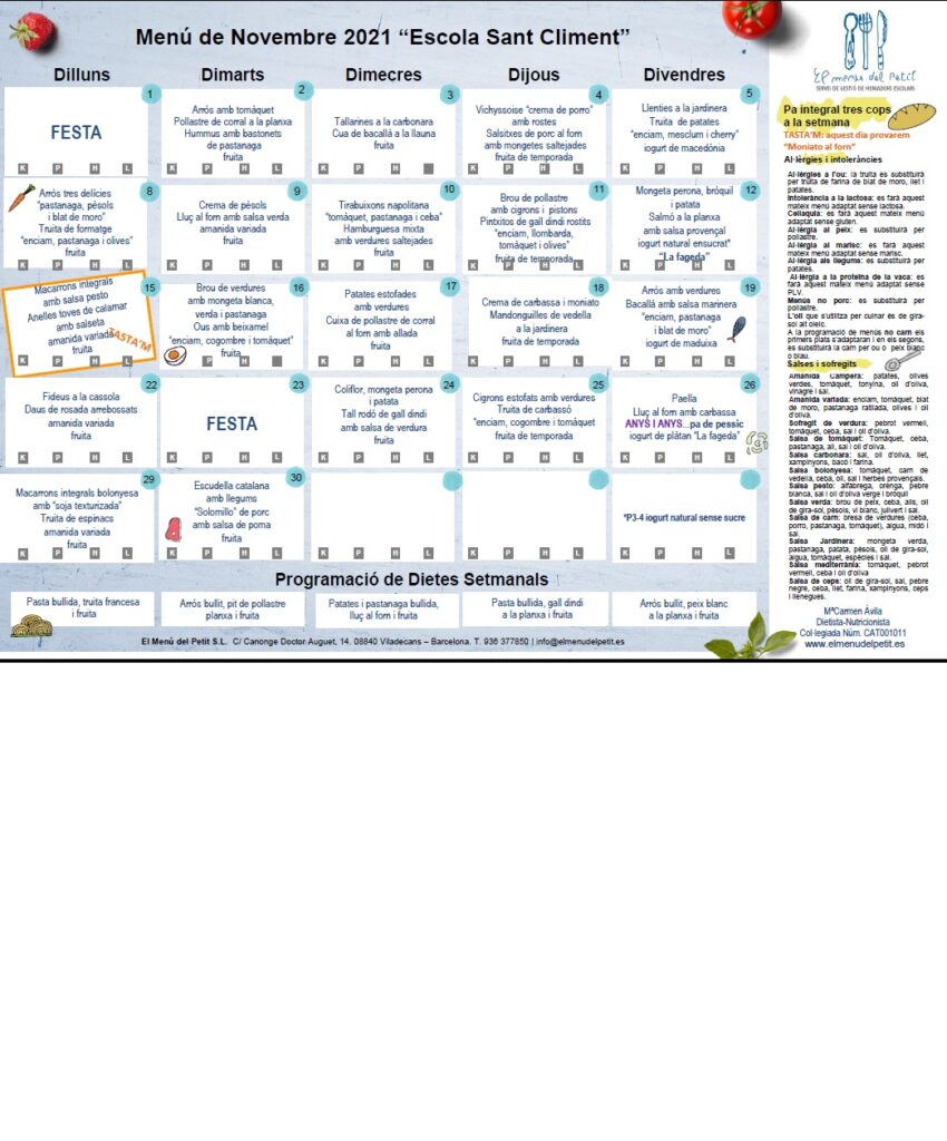 Aquí teniu la programació dels menús pel mes de novembre