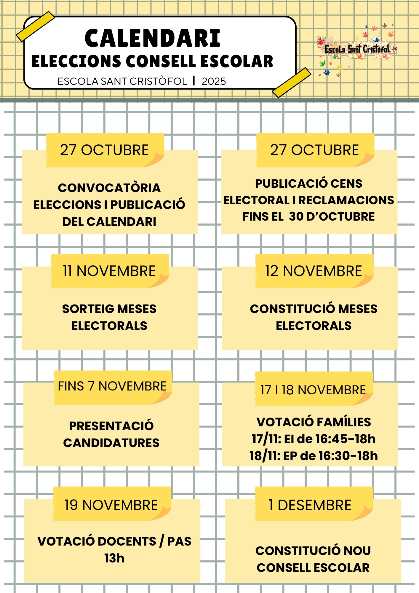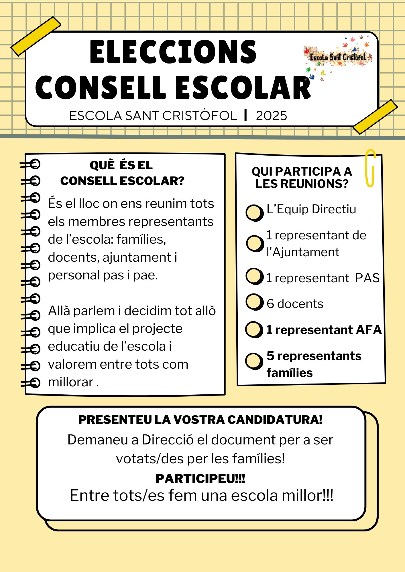 Informacions Escola En aquest apartat us anirem informant de les últimes informacions a l’escola! OBERTA LA CONVOCATÒRIA DE LES ELECCIONS AL CONSELL ESCOLAR