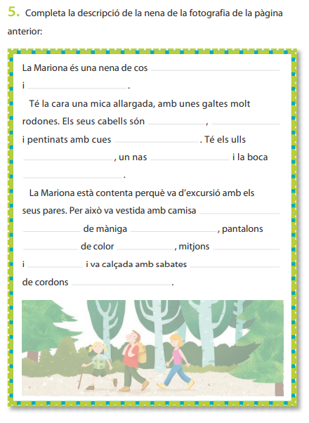 Heu d’observar la fotografia i escriure els adjectius corresponents. Els alumnes de primer escriviu frases sobre la nena. Els de segon completeu la fitxa de la seva descripció.
