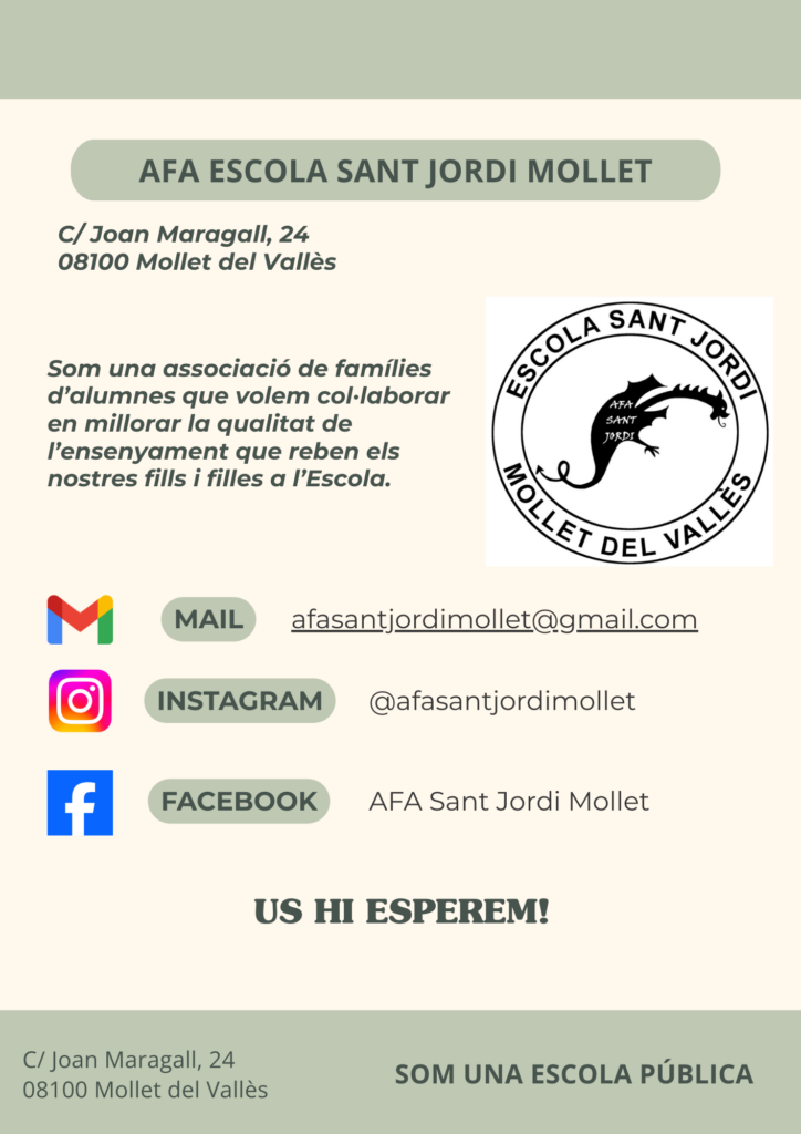 Associació de famílies de l’escola Sant Jordi PRESENTACIÓ AFA ESCOLA SANT JORDI https://agora.xtec.cat/ceipsantjordimollet/wp-content/uploads/usu1123/2026/02/AFA-Sant-Jordi-2026-1.pdf