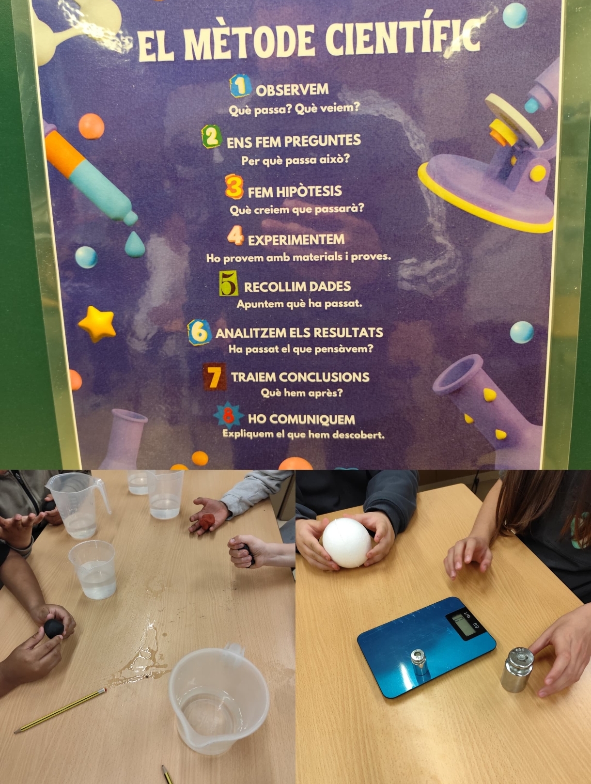 A cinquè hem iniciat el tema de la matèria, descobrint conceptes com el volum, la massa i la densitat. Per fer-ho d’una manera més vivencial, hem baixat al laboratori de l’escola, on hem pogut experimentar i posar en pràctica el mètode científic.
