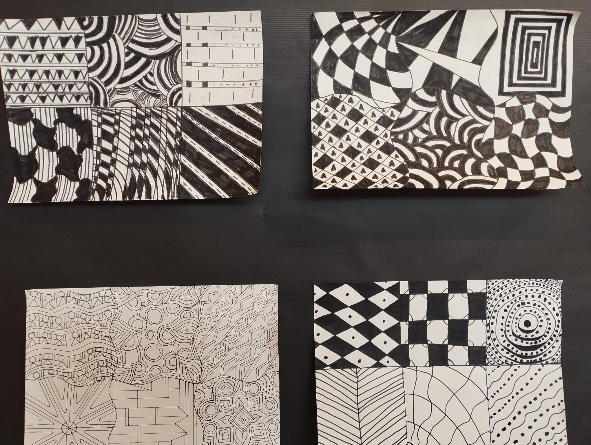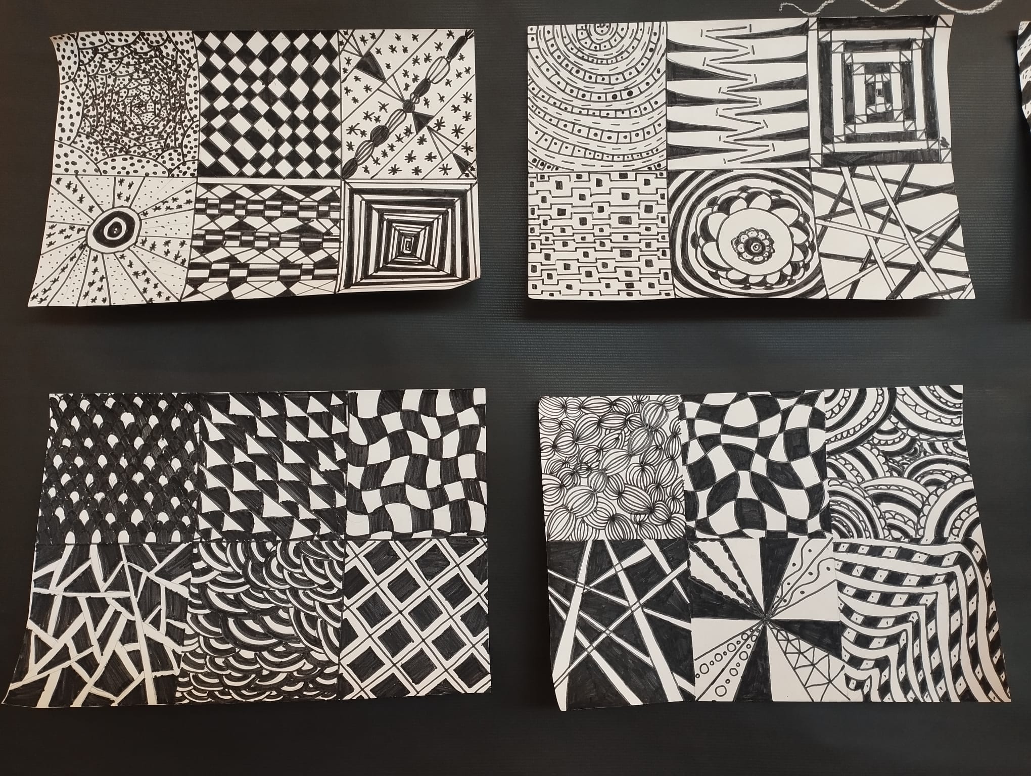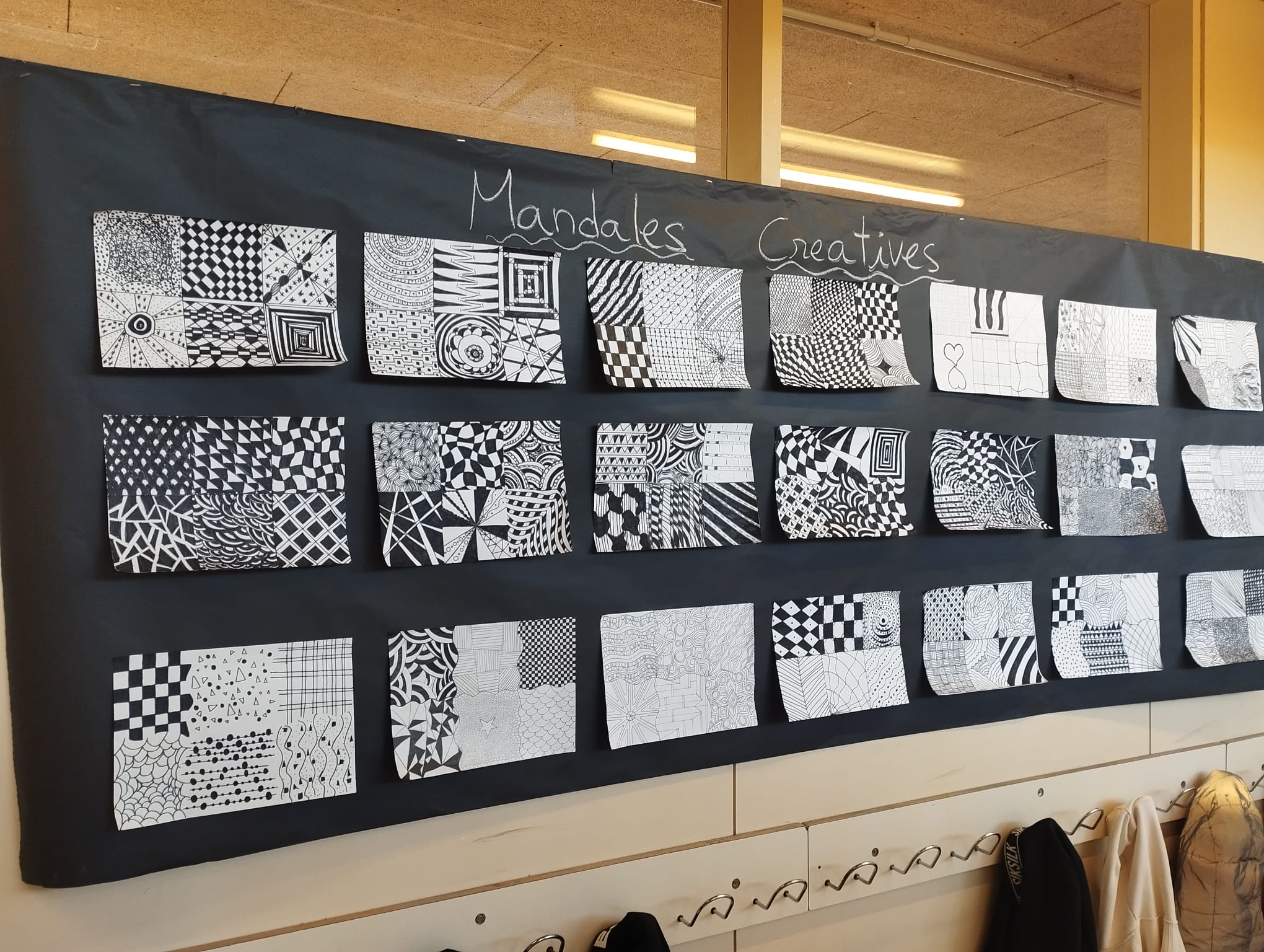 Els alumnes de sisè han elaborat mandales en blanc i negre, treballant el traç, les formes i el contrast. Aquesta activitat els ha permès practicar la precisió, l’organització de l’espai i l’atenció al detall.