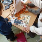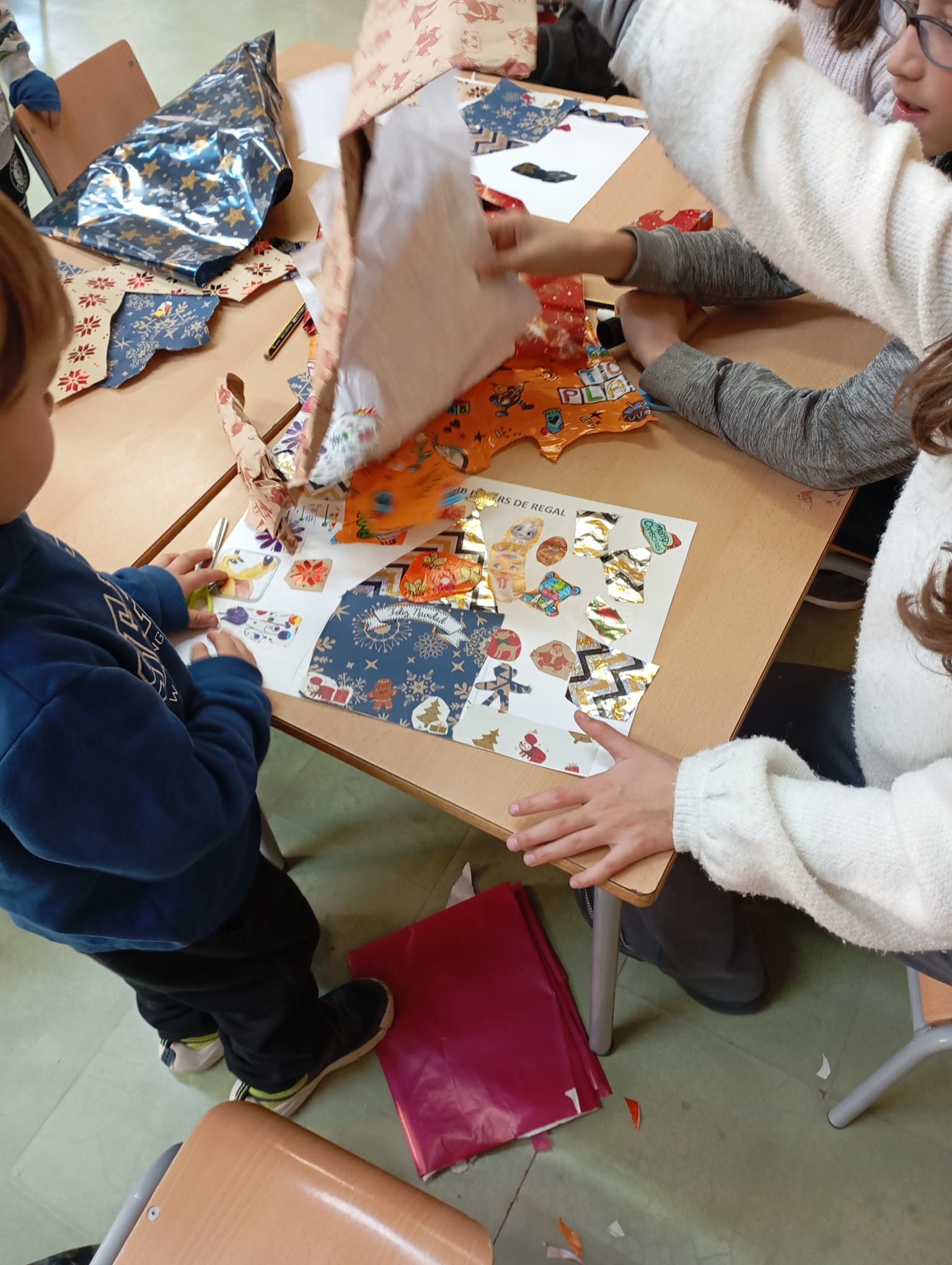 En la primera trobada del 2025 els padrins grans amb els petits han creat un collage. A partir de diferents papers de regal han realitzat unes magnífiques composicions artístiques. Podeu veure les fotografies en aquest enllaç: collages cooperatius.