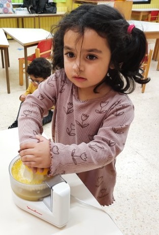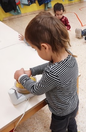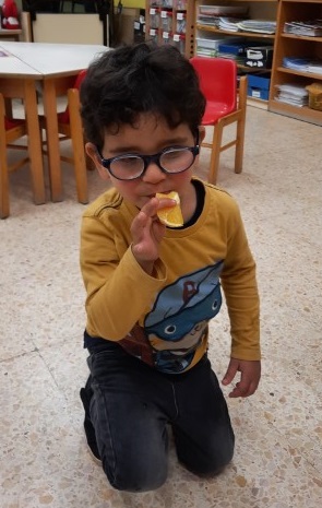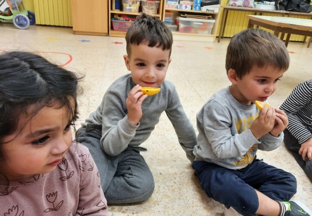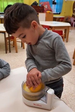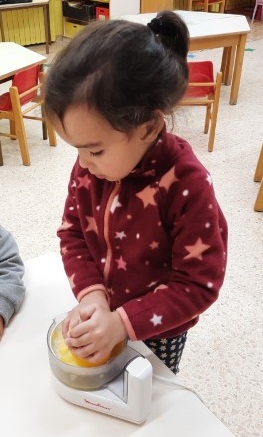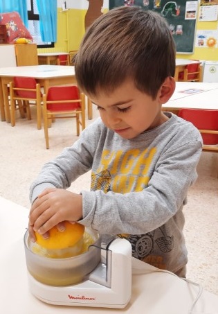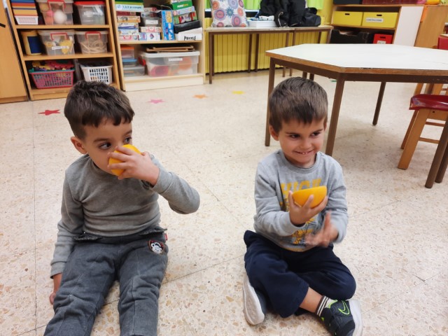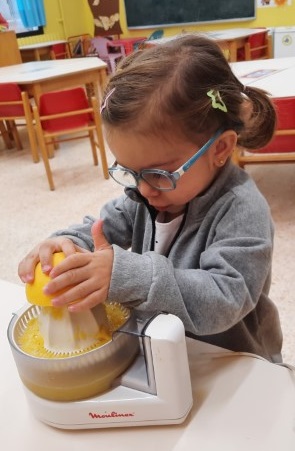 Per a treballar hàbits saludables en alimentació, aquesta tarda he portat a l’aula de P3 taronges, un ganivet, un espremedor i gotets. Què podem fer amb tot això?
