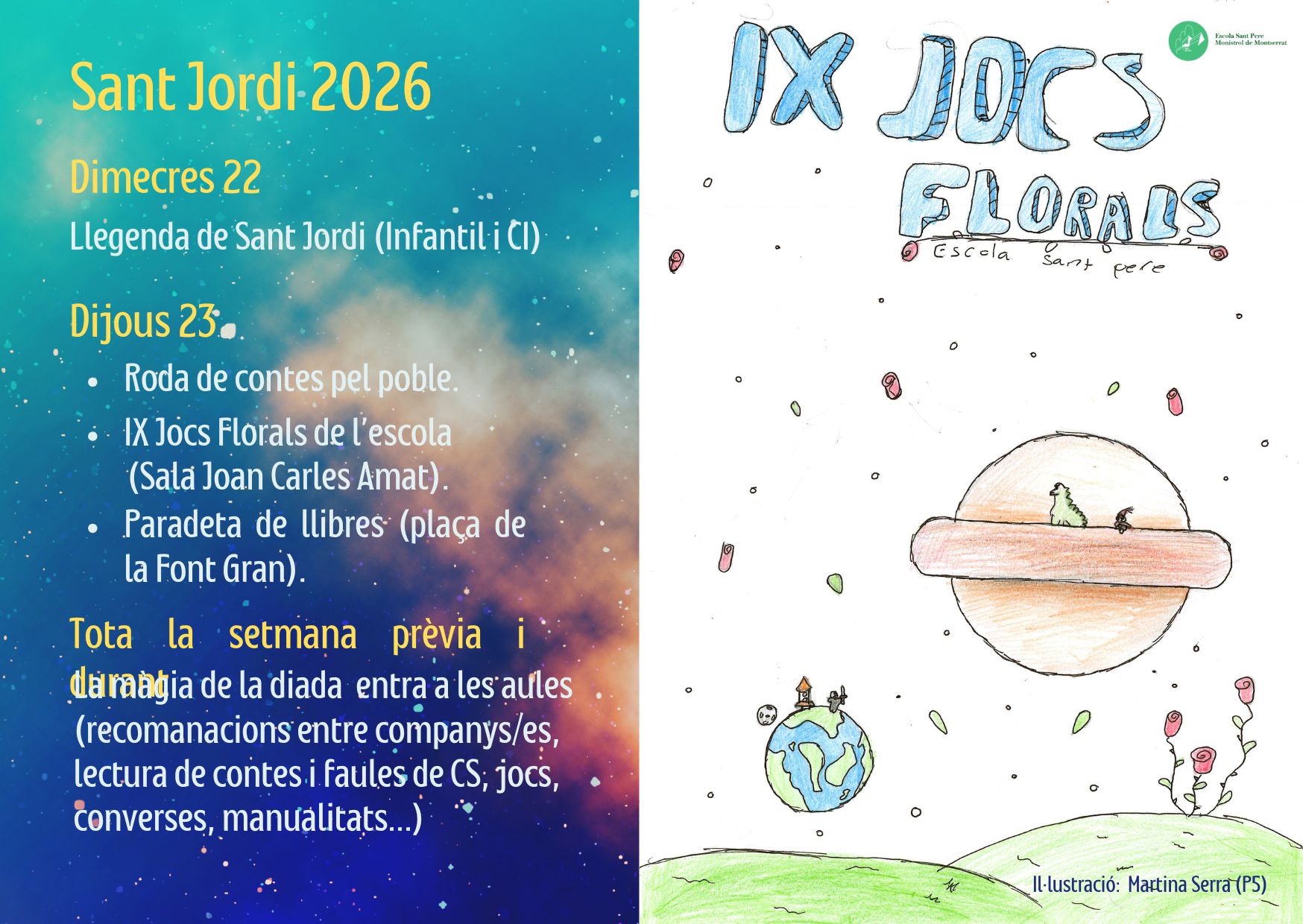 Compartim amb vosaltres els textos guanyadors del IX Jocs Florals de l’escola Sant Pere. Aquest any l’univers, com a tema del curs, ha inspirat el certamen. Volem felicitar a tothom per l’esforç que ha fet en crear les seves obres. Sou uns artistes del dibuix i la paraula, visca la imaginació i la creativitat! Podeu […]