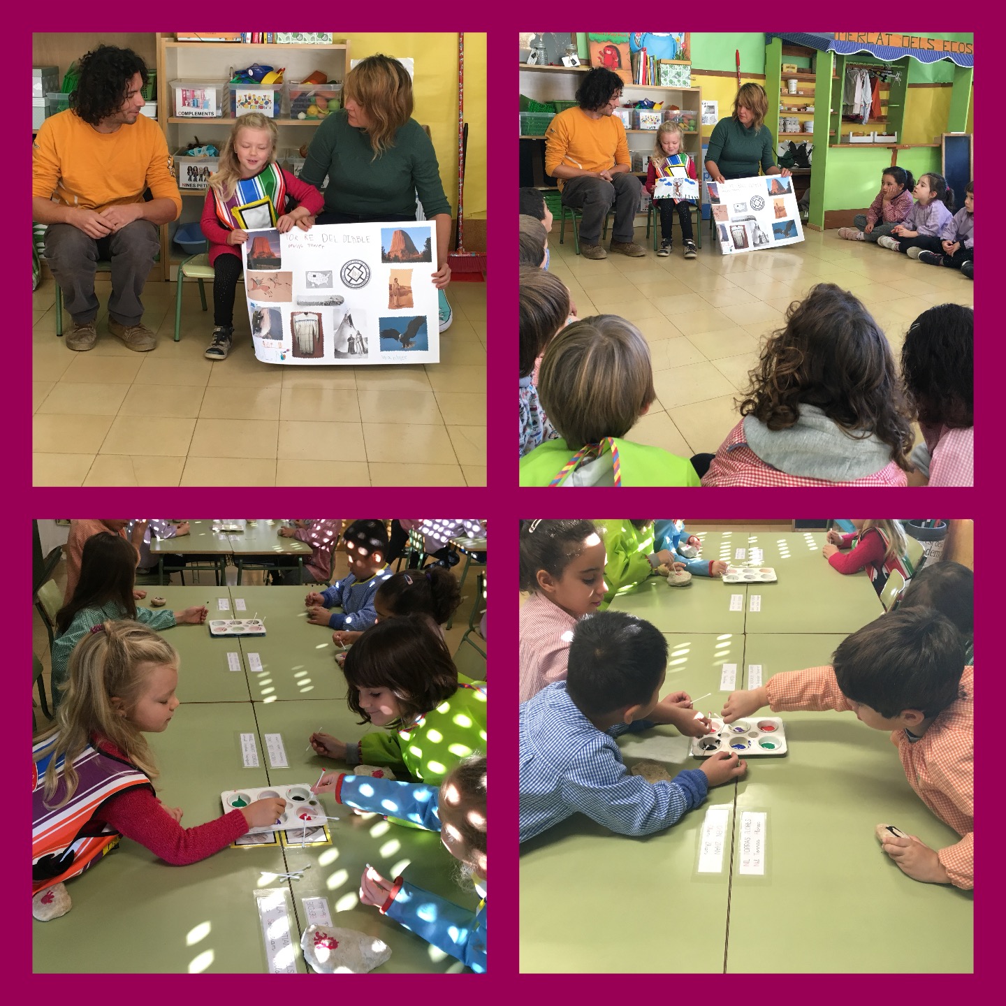 Els pares de la Ella van venir a l’escola ha explicar-nos la llegenda de La torra dels Diables dels Estats Units, després vàrem fer el ball d’indis i tot seguit ens van repartir unes pedres grans per fer un dels símbols representatius de la llegenda.