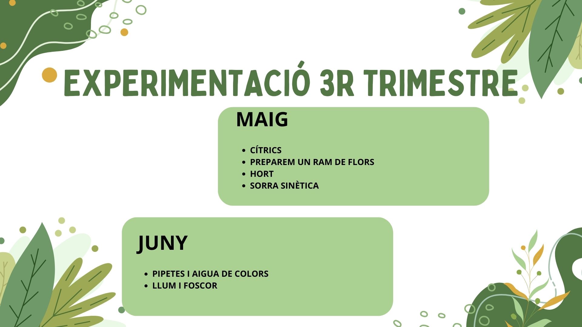 EXPERIMENTACIÓ 3R TRIMESTRE Feu un comentari / Per admin / 05/05/2025 / Curs 2024-2025 / Experimentació Estimades famílies, Aquí us comparteixo les experimentacions d’aquest trimestre. Peseu que és orientatiu. Moltíssimes gràcies