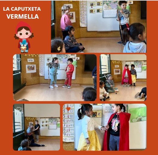 Durant aquest segon trimestre, estem treballant el conte popular La caputxeta vermella. És un conte popular europeu del qual existeixen nombroses variants. Ha estat transcrit, entre d’altres, per Charles Perrault i els germans Grimm. La història se centra en el contrast entre el món lluminós i segur del poble i l’obscur del bosc, una antítesi típicament medieval.