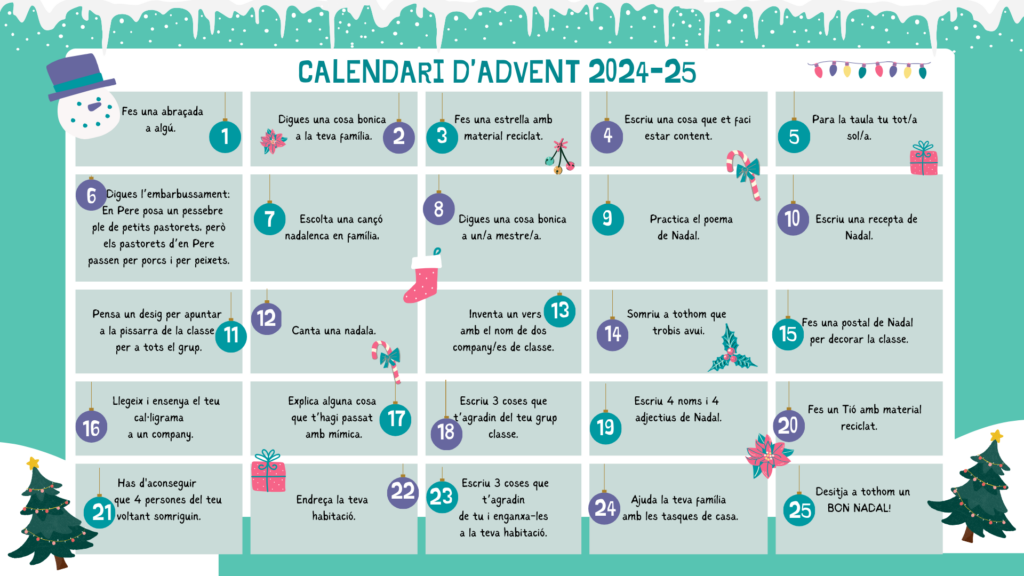 Si és necessari, podeu anotar el que us demani a l’agenda del dia que esteu fent, o en un paper, així ho podem compartir a classe. A l’aula descobrirem els regals que ens ofereix aquest calendari d’advent tan divertit si heu completat les activitats que us demana.