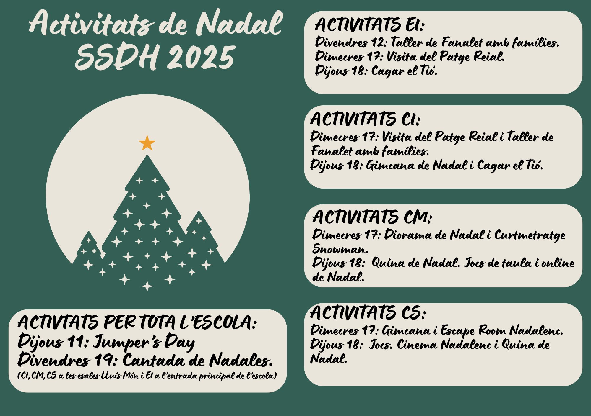 Aquesta última setmana d’escola cada cicle ha fet activitats diverses per anar preparant el Nadal. Els més menuts han fet cagar el Tió, ens ha visitat un Patge Reial i hem pogut entregar la carta amb molta il·lusió. També han fet un taller de fanalets amb l’ajuda de les famílies. L’alumnat de Primer i Segon han participat d’una gimcana. Els de cicle wazamba casino mitjà han elaborat un diorama i han participat d’una gran quina molt divertida. Els més grans han perdut la màgia del Nadal i l’han cercat tots junts fent un Scape Room molt original. Sort que ja tornem a tenir llum!