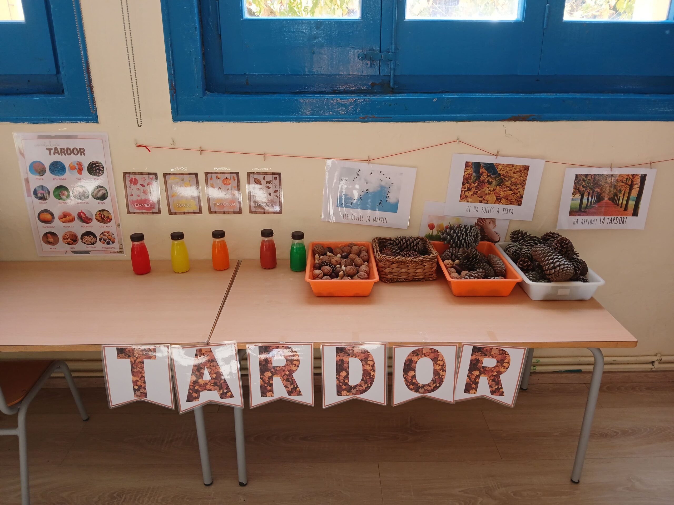 Hem descobert els colors de la tardor de diferents maneres: tenyint aigua dins unes ampolles, pintant amb les mans, enganxant paperets de colors o pintant amb ceres.
