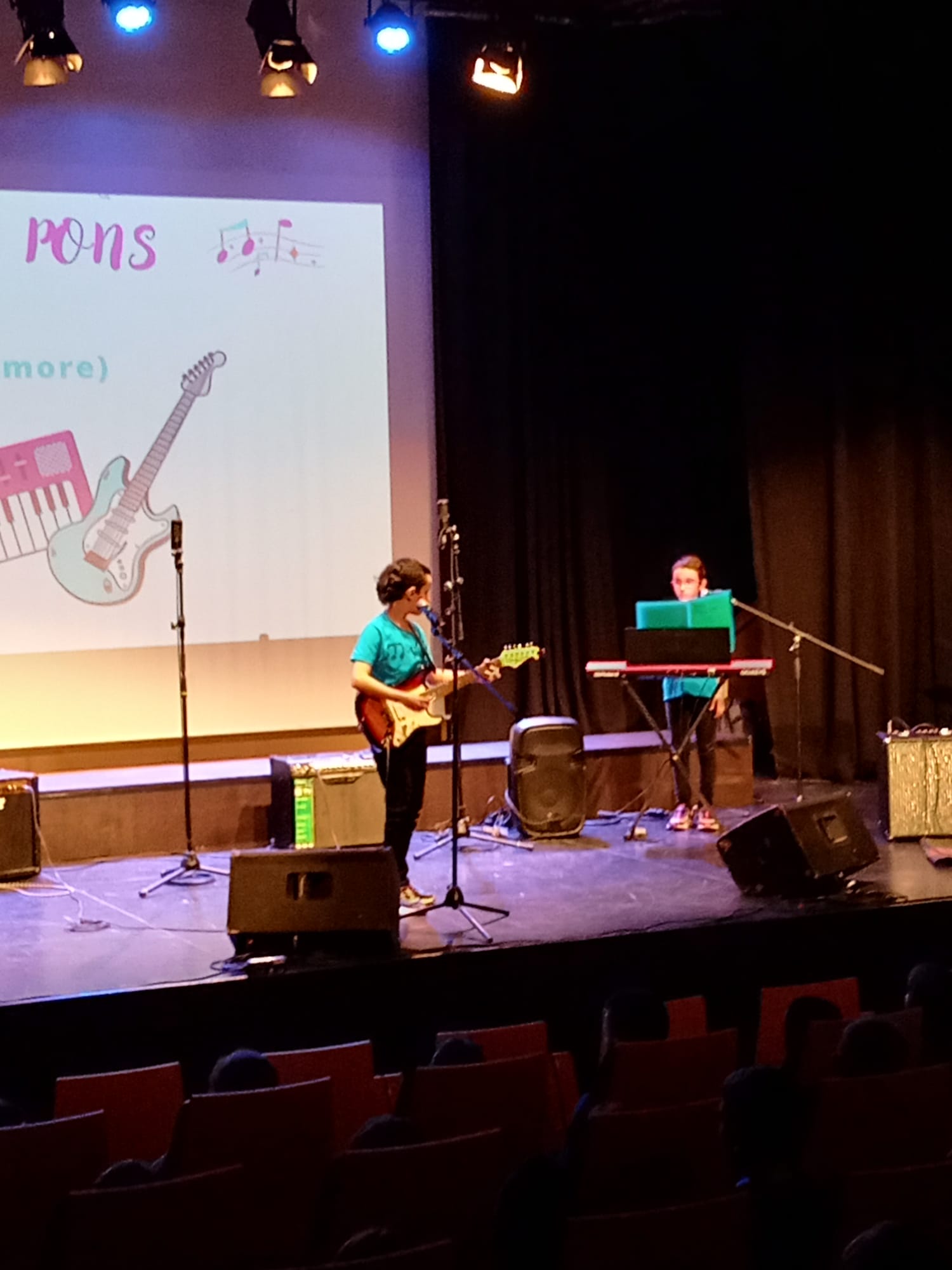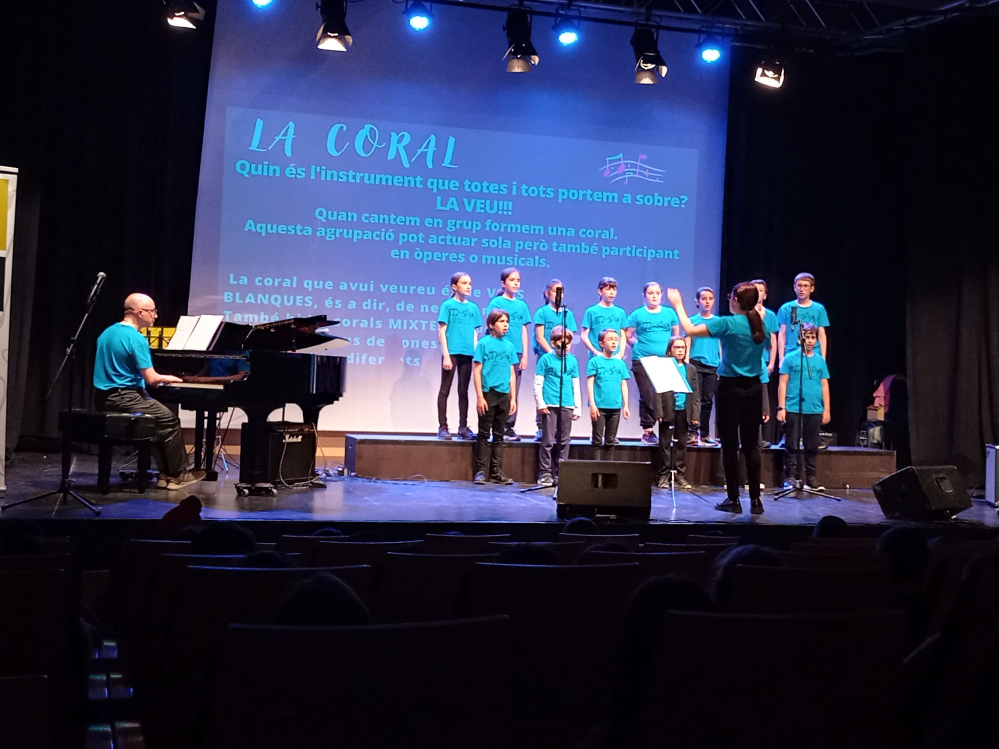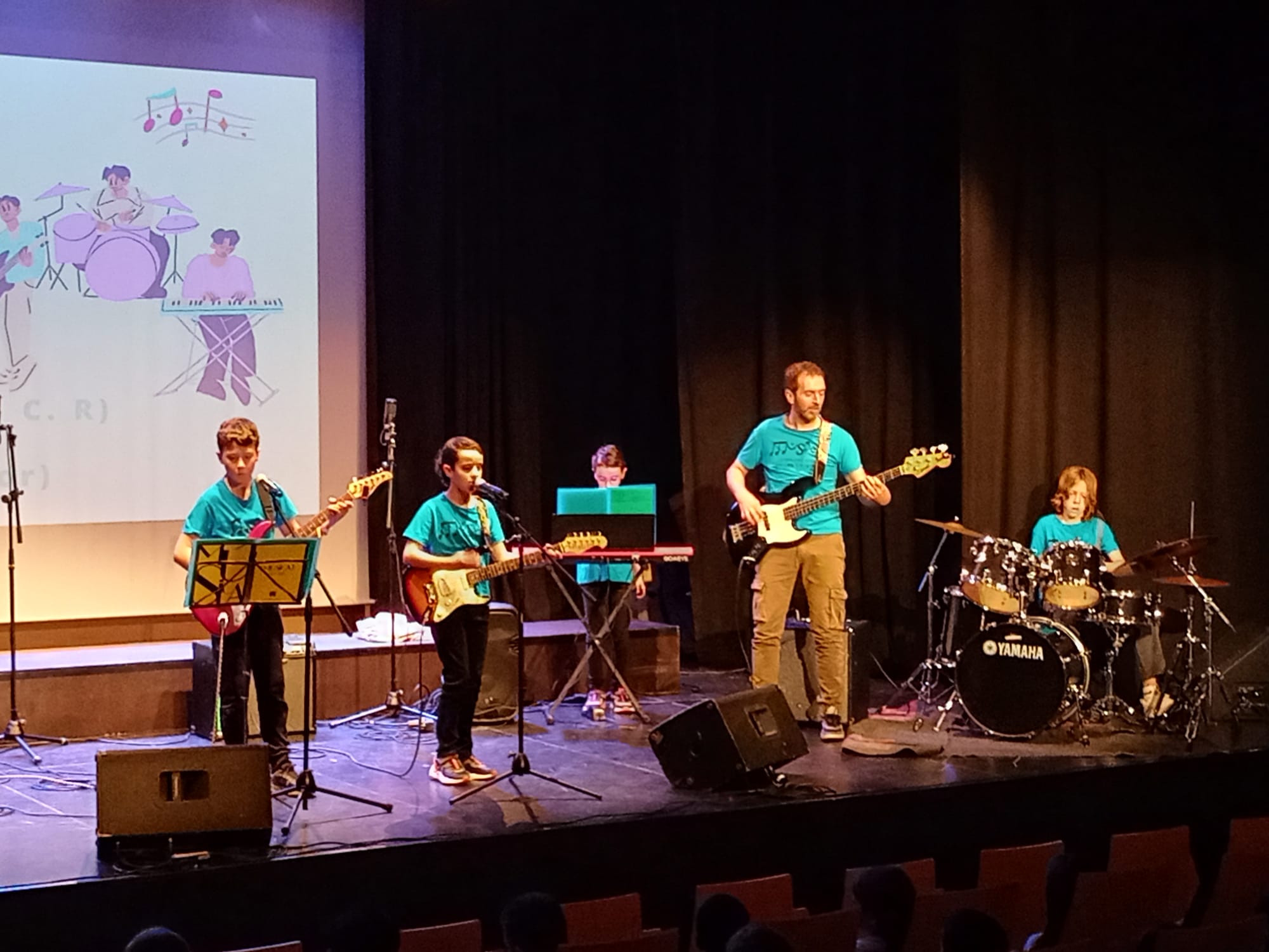 Els i les artistes que estaven a sobre l’escenari eren els alumnes de l’escola de Música Municipal Josep Carbó, entre els quals hi havia companys de la nostra escola: La Maria, la Berta, la Jana, l’Aleix, l’Elena i l’Íngrid.