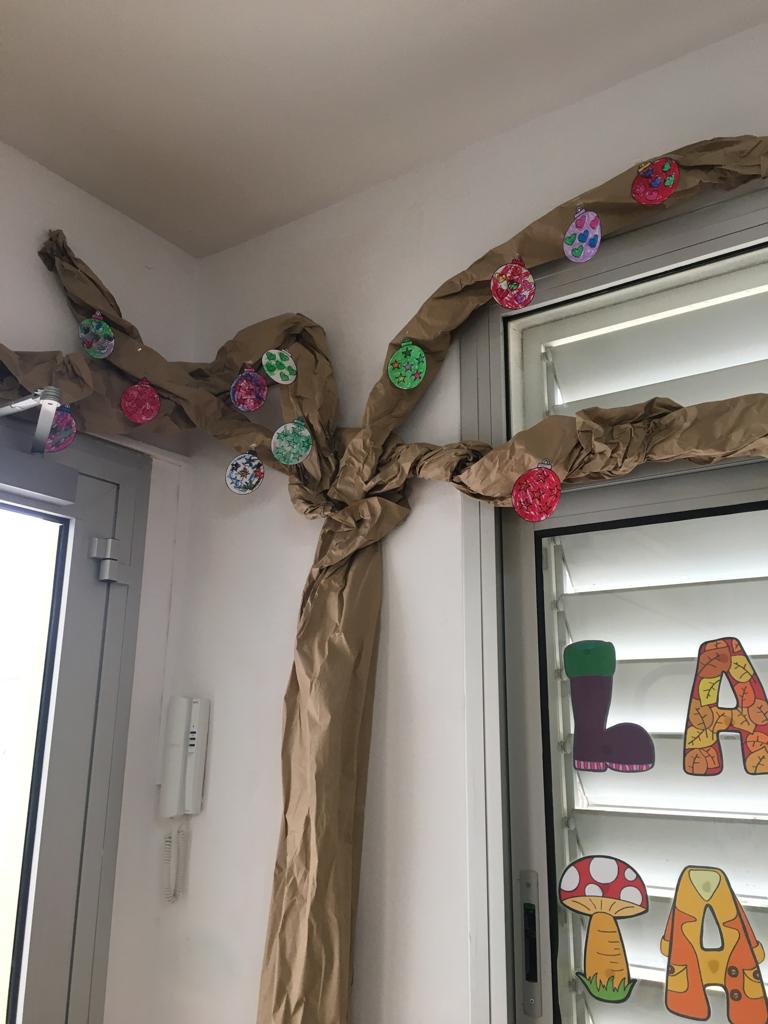 Arbre de P3 qua va canviant segons les estacions de l’any! Aquest cop han caigut les fulles i l’han guarnit amb boles de colors.