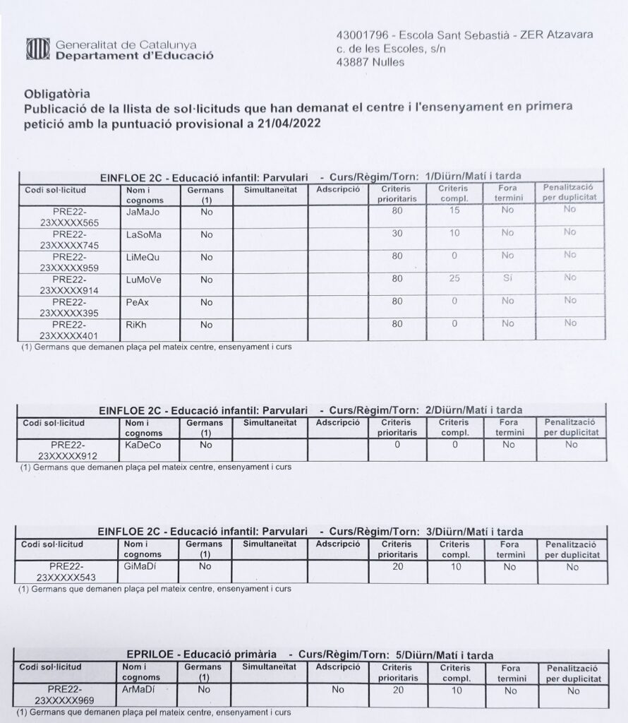 Publicació de la llista de sol·licituds que han demanat centre i l’ensenyament en primera petició amb la puntuació provisional a 21 d’abril de 2021.