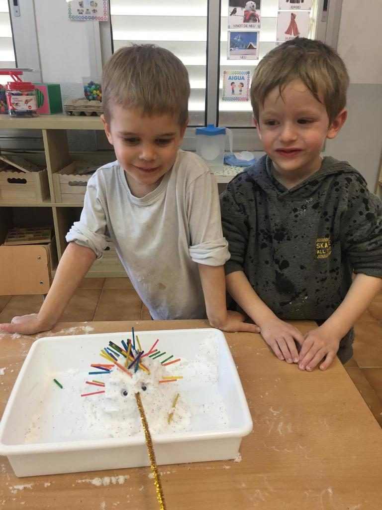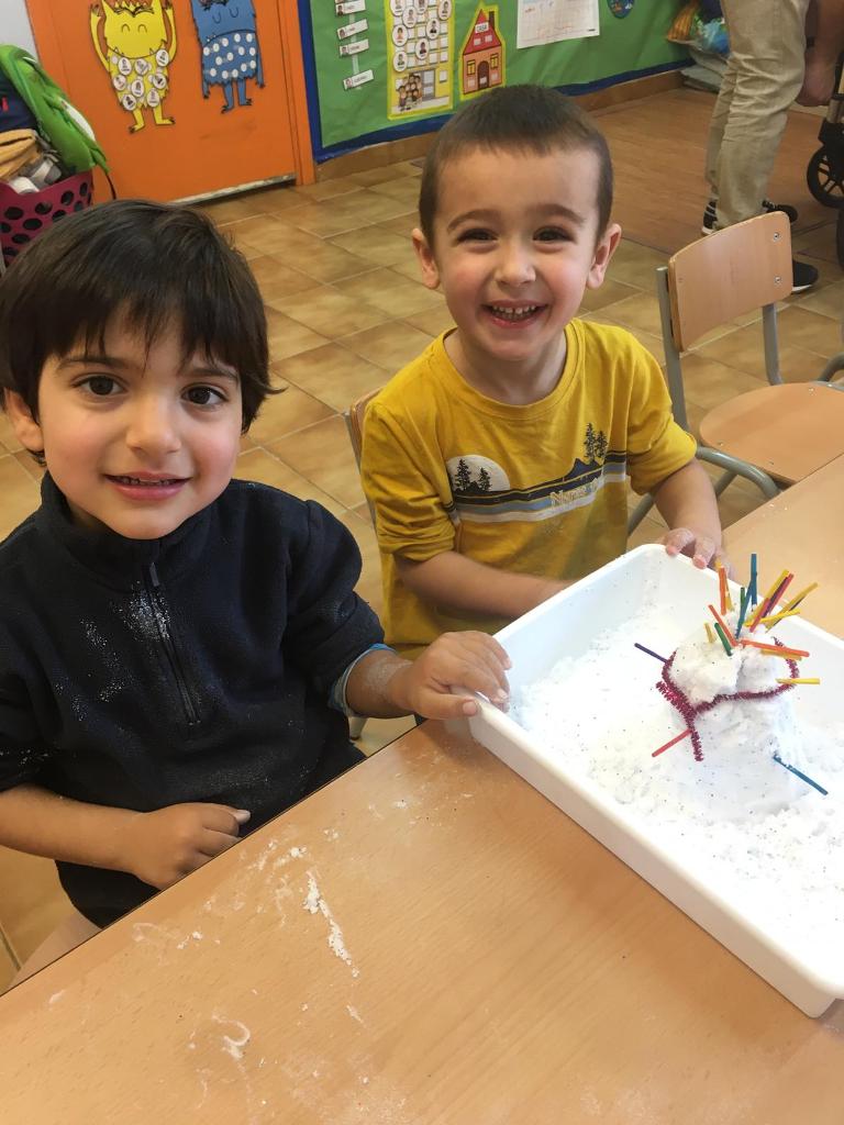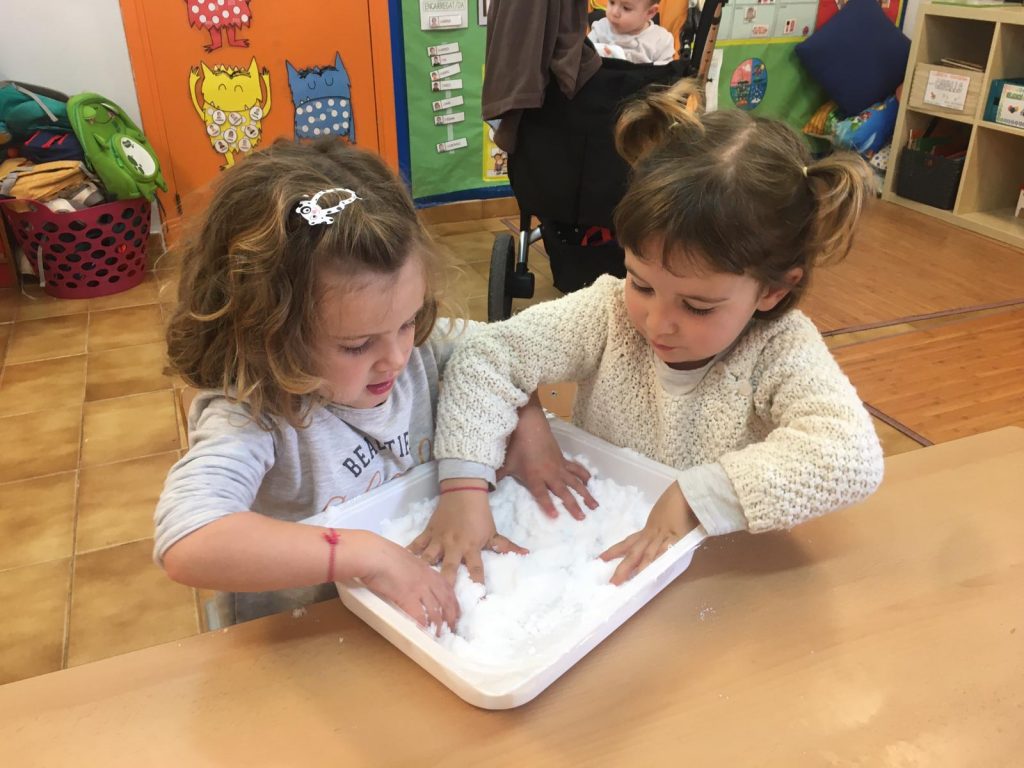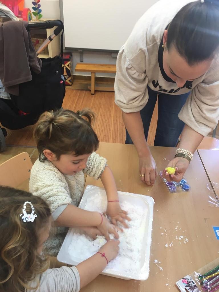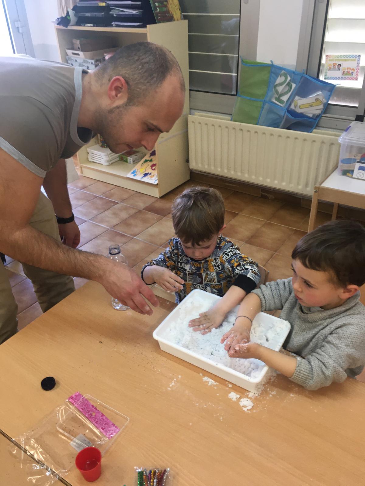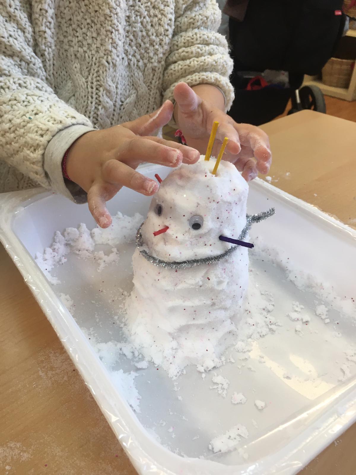 El divendres 31 de gener vam rebre la visita de la primera família que ens va acompanyar una tarda a la nostra classe. Ens van ensenyar com es fa la neu artificial!! Tots els nens i les nenes vam fer ninots de neu… després els hi vam posar purpurina de colors i diversos palets.
