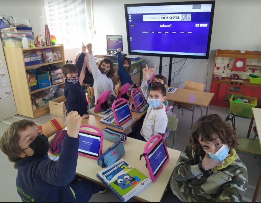 Aquest joc s’anomena Kahoot, i consisteix a respondre unes preguntes amb un cert temps. A la pissarra general de l’aula, se’ls projecta una pregunta relacionada amb els continguts que s’han treballat a l’aula, i tres o quatre opcions, de les quals només una és correcta. Un cop llegida la pregunta, comença el temps enrere, i l’alumnat ha de respondre tot marcant la pregunta correcta. Per fer-ho cadascú té una tauleta.