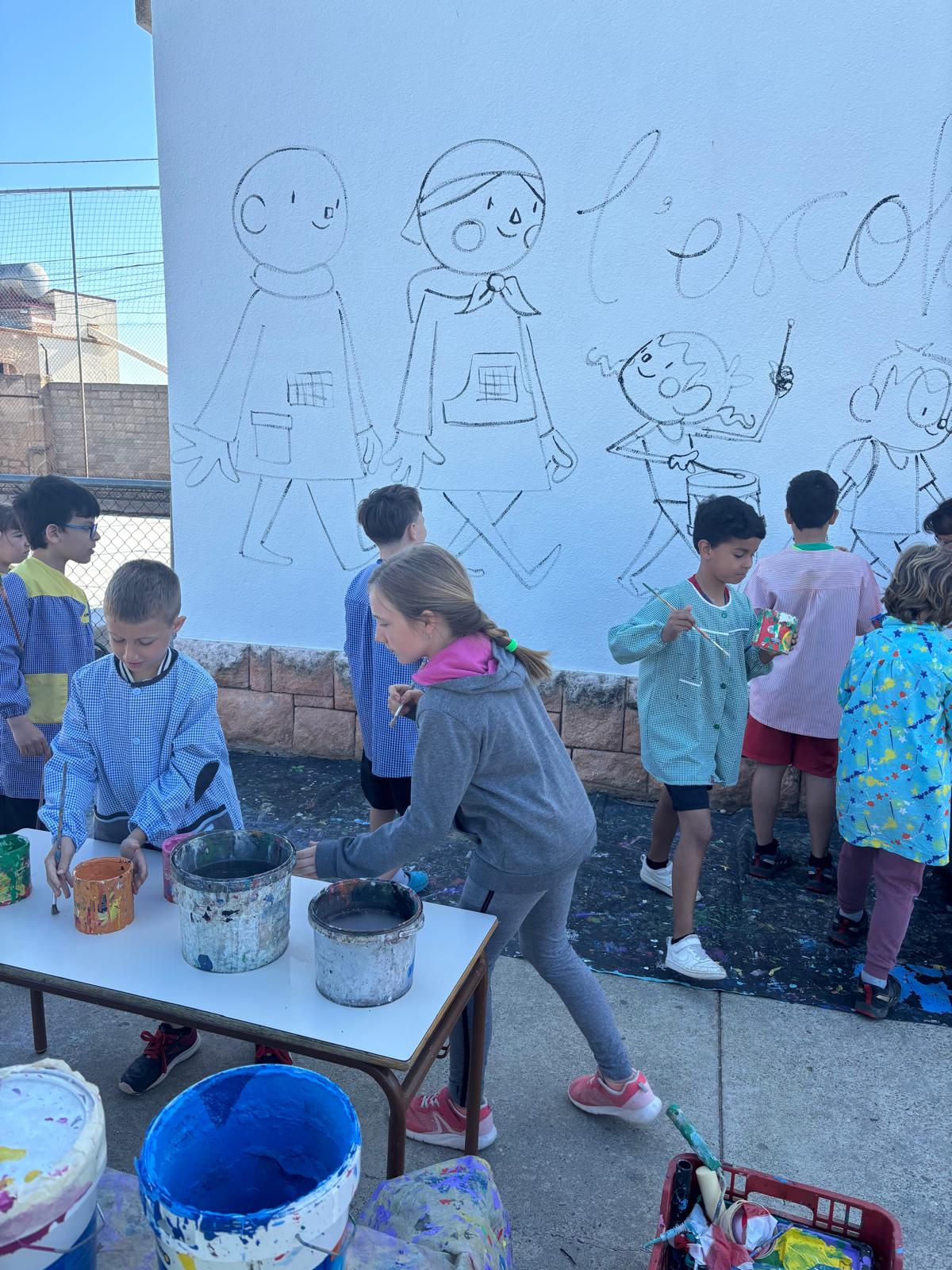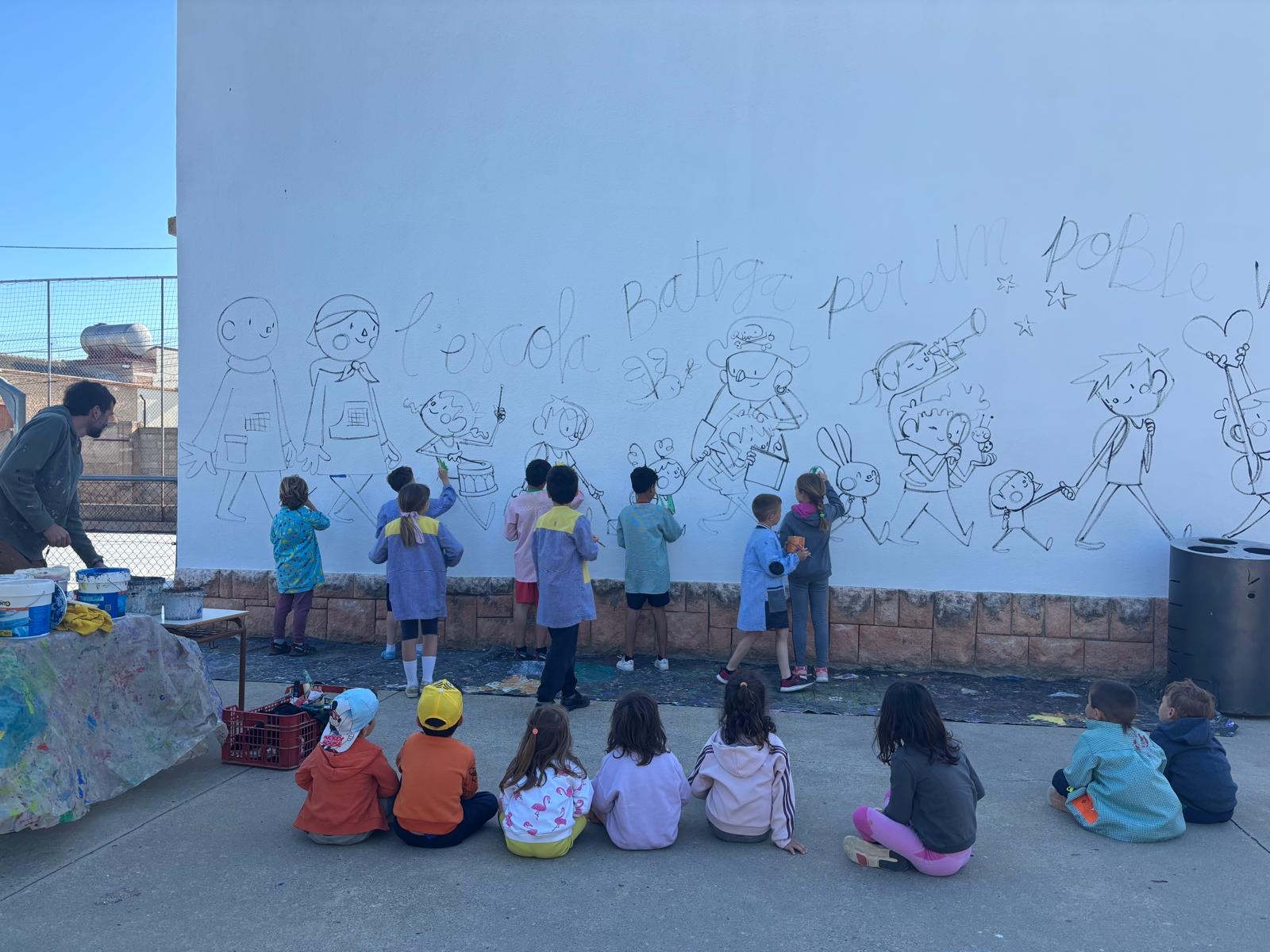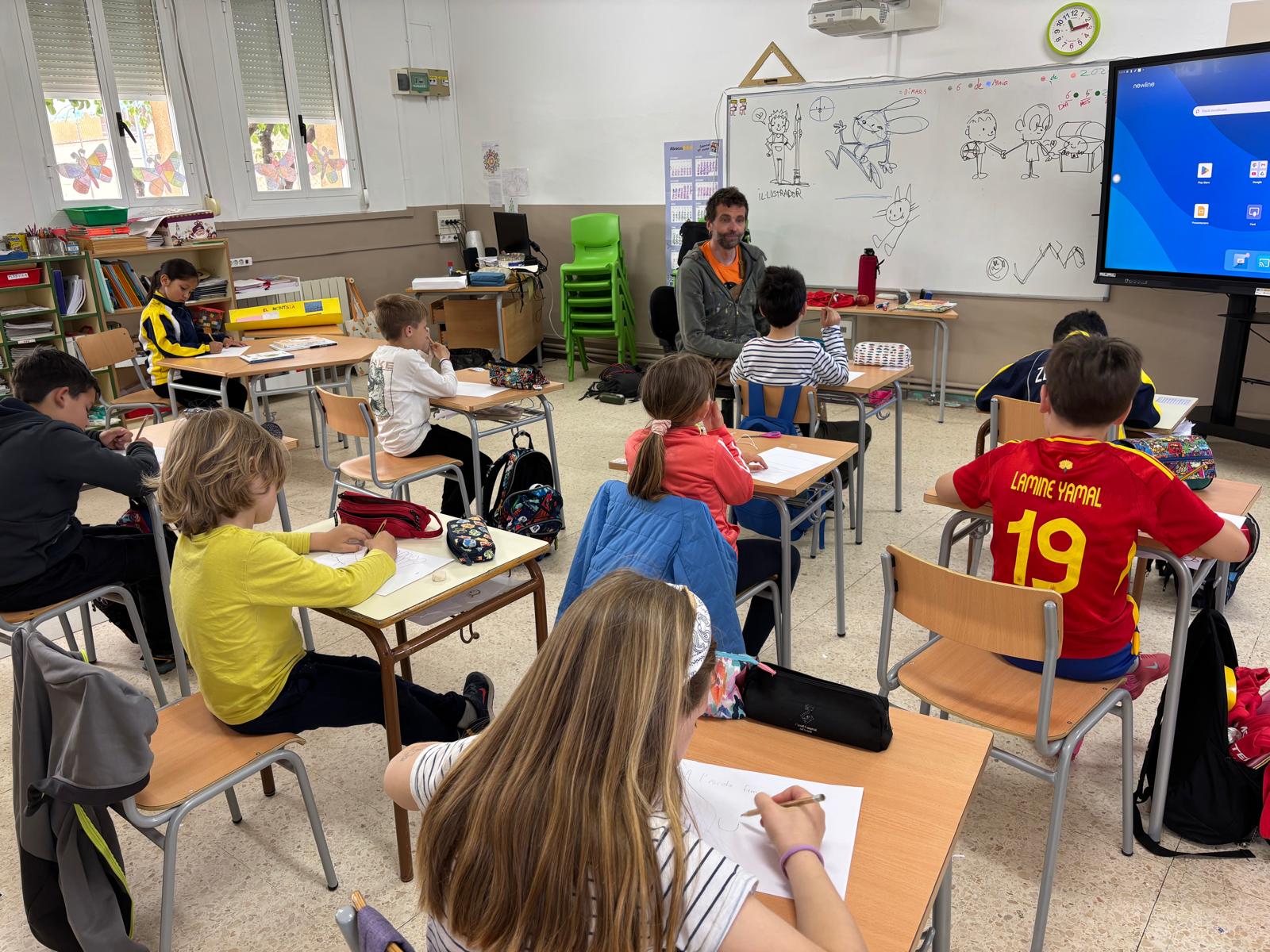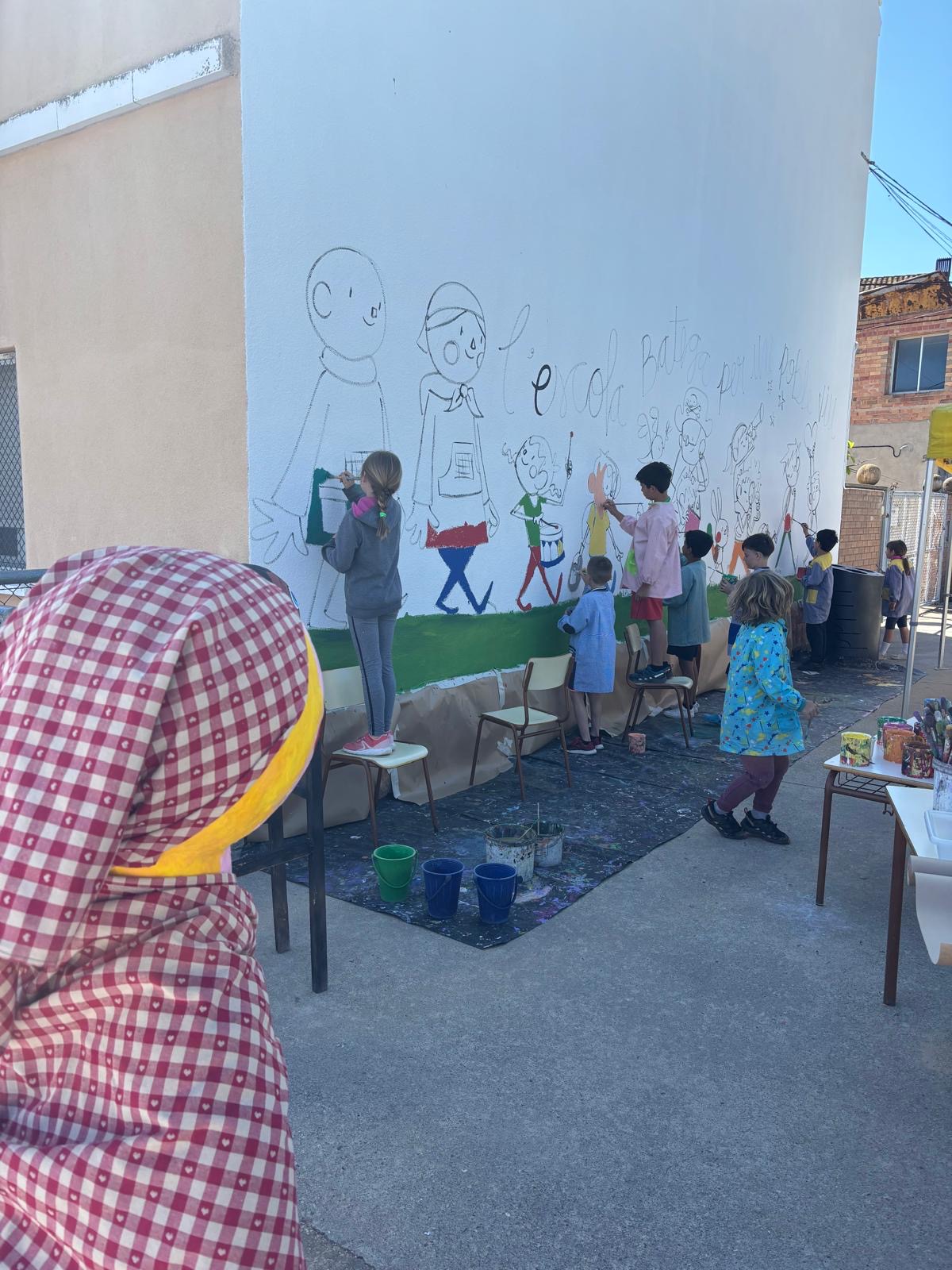 El Joan a més a més d’explicar-nos la seva professió: il.lustrador, ens ha permés compartir les nostres idees i plasmar-les al seu estil en un mural que ha quedat fantàstic a l’entrada del recinte escolar.