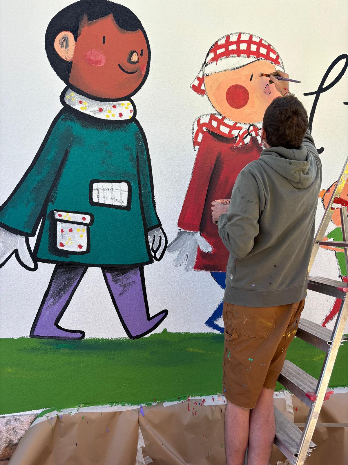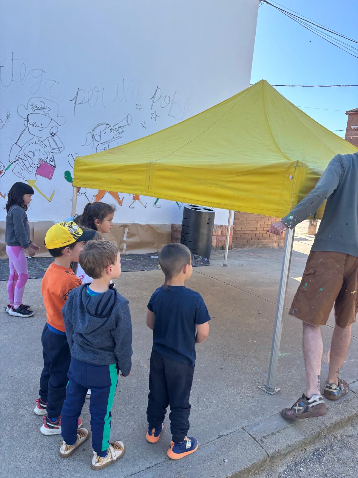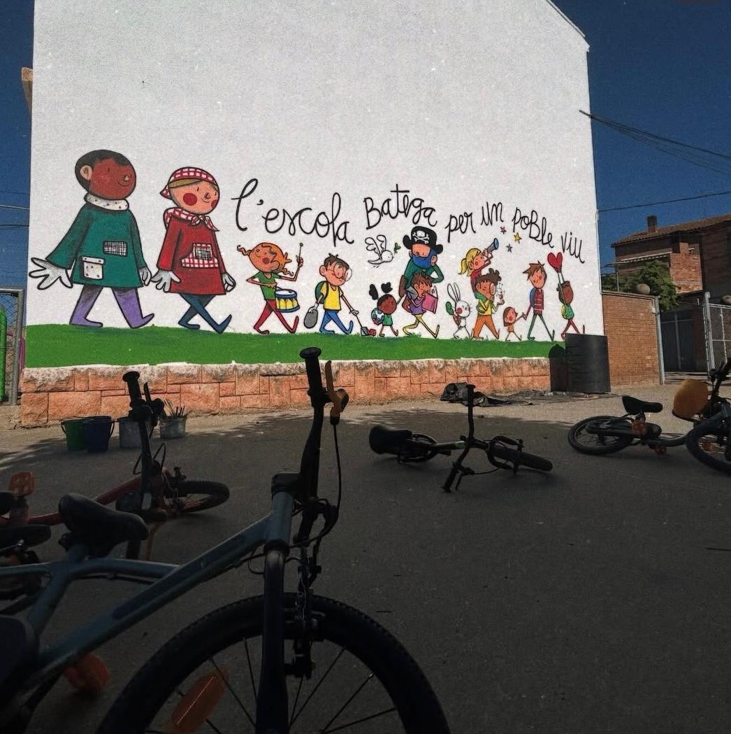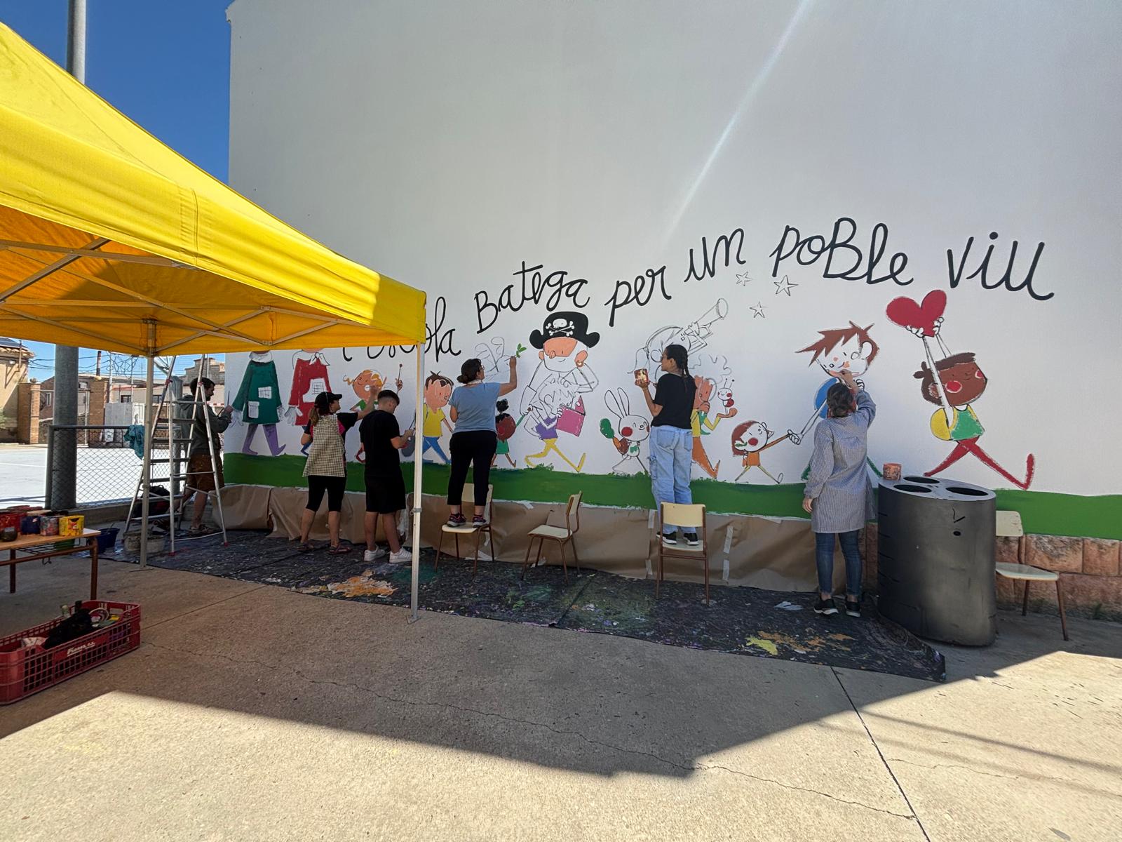 El Joan a més a més d’explicar-nos la seva professió: il.lustrador, ens ha permés compartir les nostres idees i plasmar-les al seu estil en un mural que ha quedat fantàstic a l’entrada del recinte escolar.