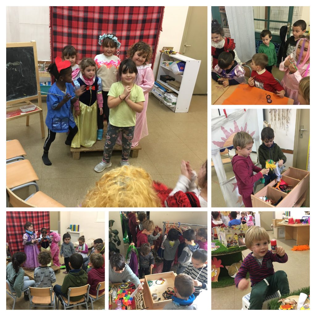 COMPARTIM JUNTS I JUNTES MOMENTS MOLT ESPECIALS: ENS DISFRESSEM I ENS AJUDEM QUAN HO NECESSITEM, APRENEM JUNTS I JUNTES A VESTIR-NOS, A CORDAR I DESCORDAR VESTITS I SABATES, ENS PINTEM PER L’OCASIÓ, FEM D’ACTORS, ENS INVENTEM HISTÒRIES I LES REPRESENTEM DAVANT DEL PÚBLIC QUE HO DESITJA, TAMBÉ EXPLIQUEM CONTES AMB ELS TITELLES I MIREM CONTES MOLT BONICS.