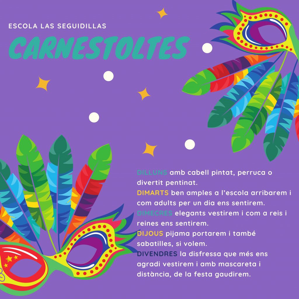 Busqueu la disfressa més divertida, agafeu la mascareta més colorida i prepareu-vos per una setmana de carnestoltes màgica i sorprenent on li direm al COVID que tot i mascaretes, distància i gel hidroalcohòlic, a la nostra escola farem gresca i gaudirem tots plegats!