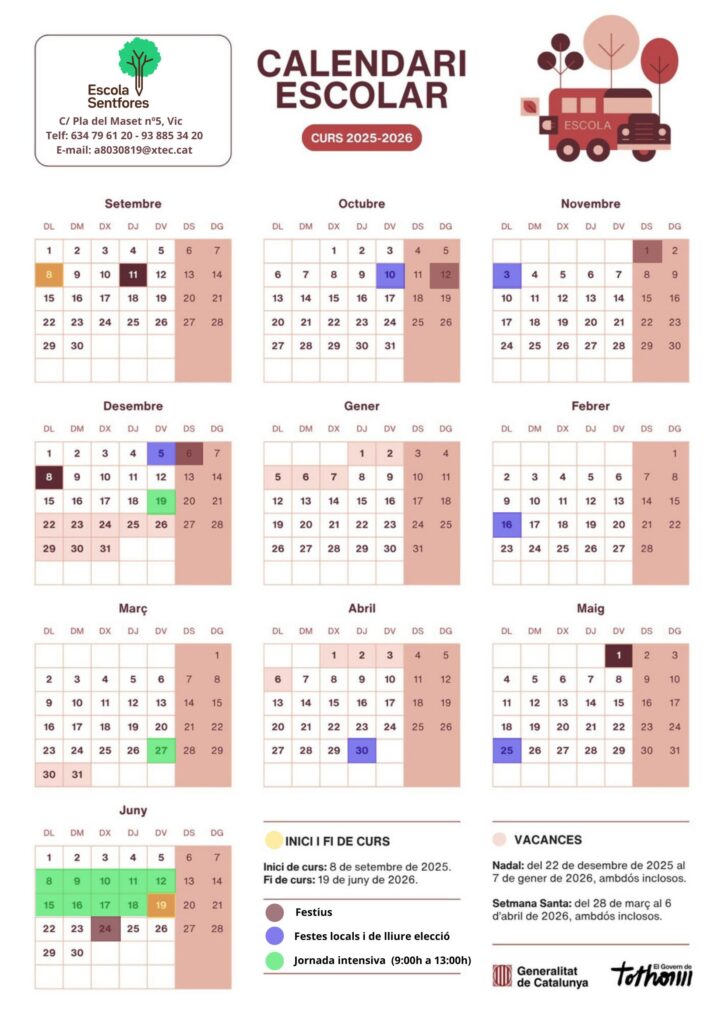El dia 19 de desembre de 2025, el 27 de març de 2026 i a partir del 8 al 19 de juny de 2026 es realitza horari intensiu de 9 a 13 h. L’alumnat que utilitza el servei de menjador surt a les 15:00h.