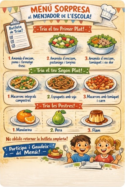 MENÚ SORPRESA – 27 de GENER El proper 27 de gener se celebrarà el menú sorpresa al menjador de l’escola. Avui, els alumnes, rebran una butlleta on hauran de triar entre tres opcions de primer plat, tres opcions de segon plat i tres opcions de postres, segons les seves preferències. Us animem a estar-ne pendents i a retornar la butlleta degudament […]